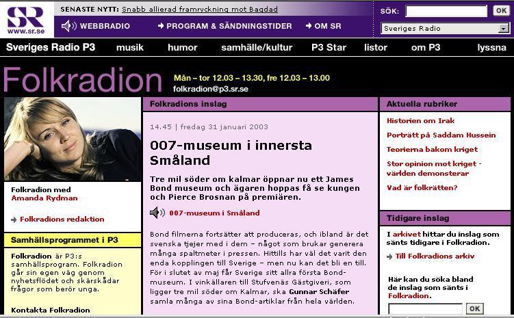 ![]() Även text tv4 har tagit upp museet samt radion Fredag 31 jan 2003 007-museum i innersta
