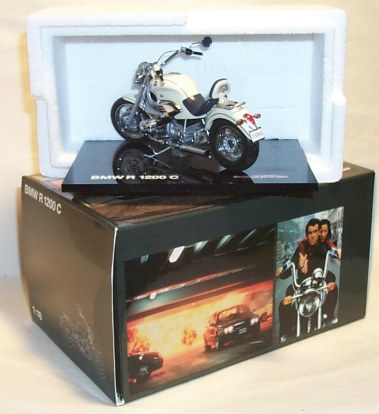 LIMITED EDITION Tomorrow Never Dies James Bond BMW R1200 C Motorcycle Cruiser (1997). 1/18 scale die-cast metal with plastic parts. Made exclusively for BMW. Features include movable front handlebars, spring suspension, fold-up rear seat, synthetic rubber tires with wire wheels, and authentic detailing. Mounted on a 3/8" black lucite base which features the Tomorrow Never Dies movie logo. Packaged in an outer box which features photos from the movie, the movie logo, and the BMW logo. Mint in mint (C-10) box. Very scarce.