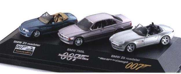 BMW Set "James Bond" BMW Z 3 roadster, BMW 7-series, BMW Z8 Scale 1:87 James Bond drives a BMW! Collectors-set including three miniatures in scale 1:87 BMW Z3 roadster "Golden Eye" (1995), BMW 750iL "Tomorrow Never Dies" (1997), BMW Z8 "The World is Not Enough" (1999) Worldwide Limited Edition 6000 sets - Collector's models - not toys. |