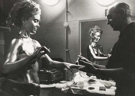 ![]() Jill Masterson: Shirley Eaton Goldpainted Den "gyllene flickan" Shirley Eaton, Idén byggde på en verklig schweizisk modell som målade sig och dog av kvävning. |