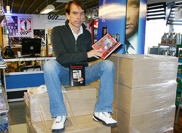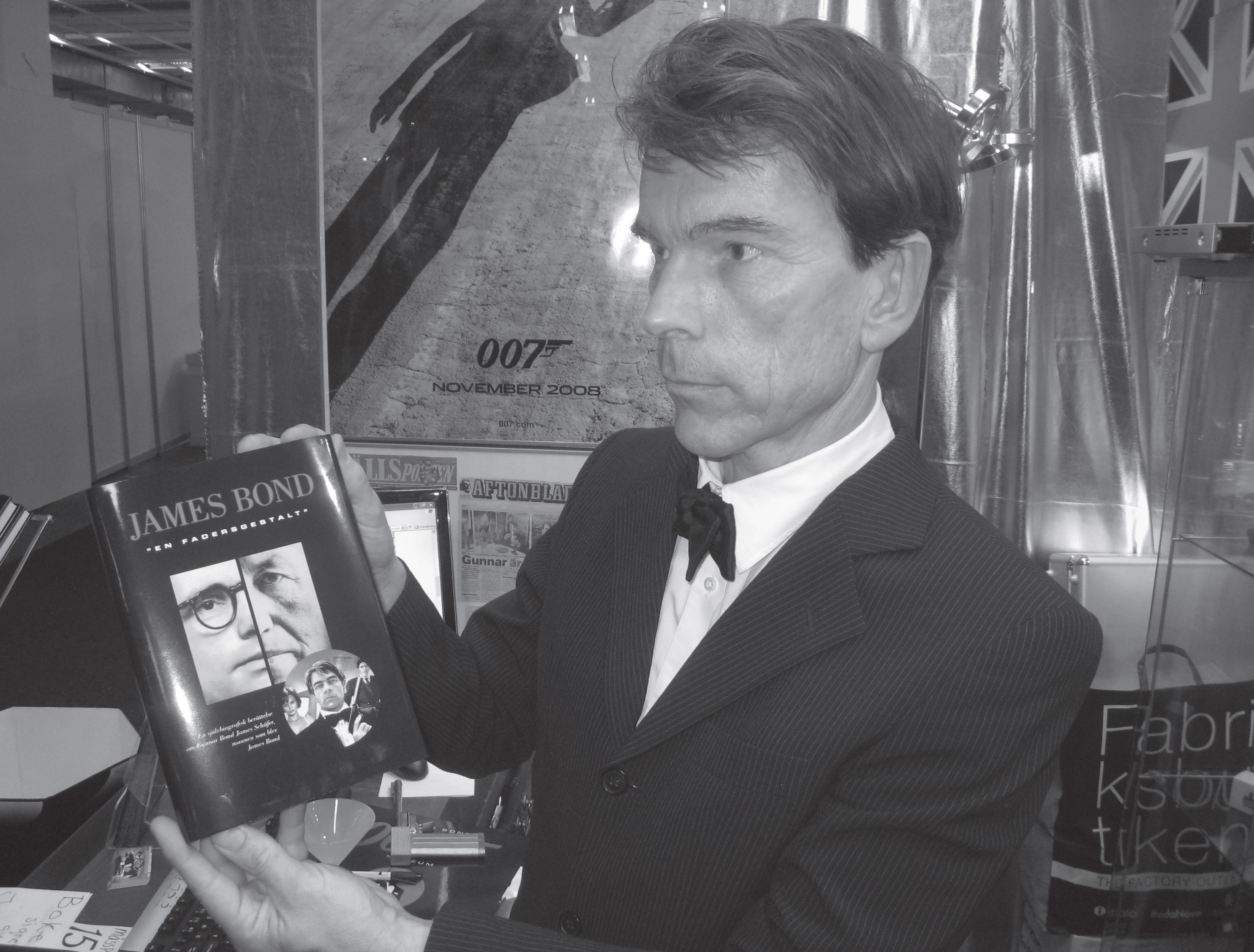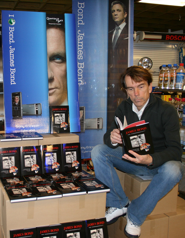| Mannen som blev James Bond, uppflugen på en pall med 1 500 nytryckta exemplar av James Bond ”En fadersgestalt", som släpptes den 25 september. | |||||