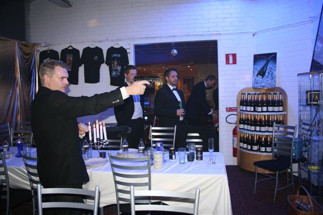 Kvällen började med en Dry Martini "Shaken not stirred " Blandad som Vesper: Även ett glas Champagne Bollinger dracks det senare under kvällen, med 007 signerade champagne glas och 007 signerade Dry Martini glas ![]() Skakad men inte rörd Egentligen börjar hela eländet i den allra först boken – Casino Royal. I kapitel 7 sitter Bond tillsammans med Felix Leiter i en bar. Det är då vår hjälte beställer en Vodka Martini, skakad men inte rörd. Men det är inte vilken Martini som helst. Den skall bestå av följande ingredienser: