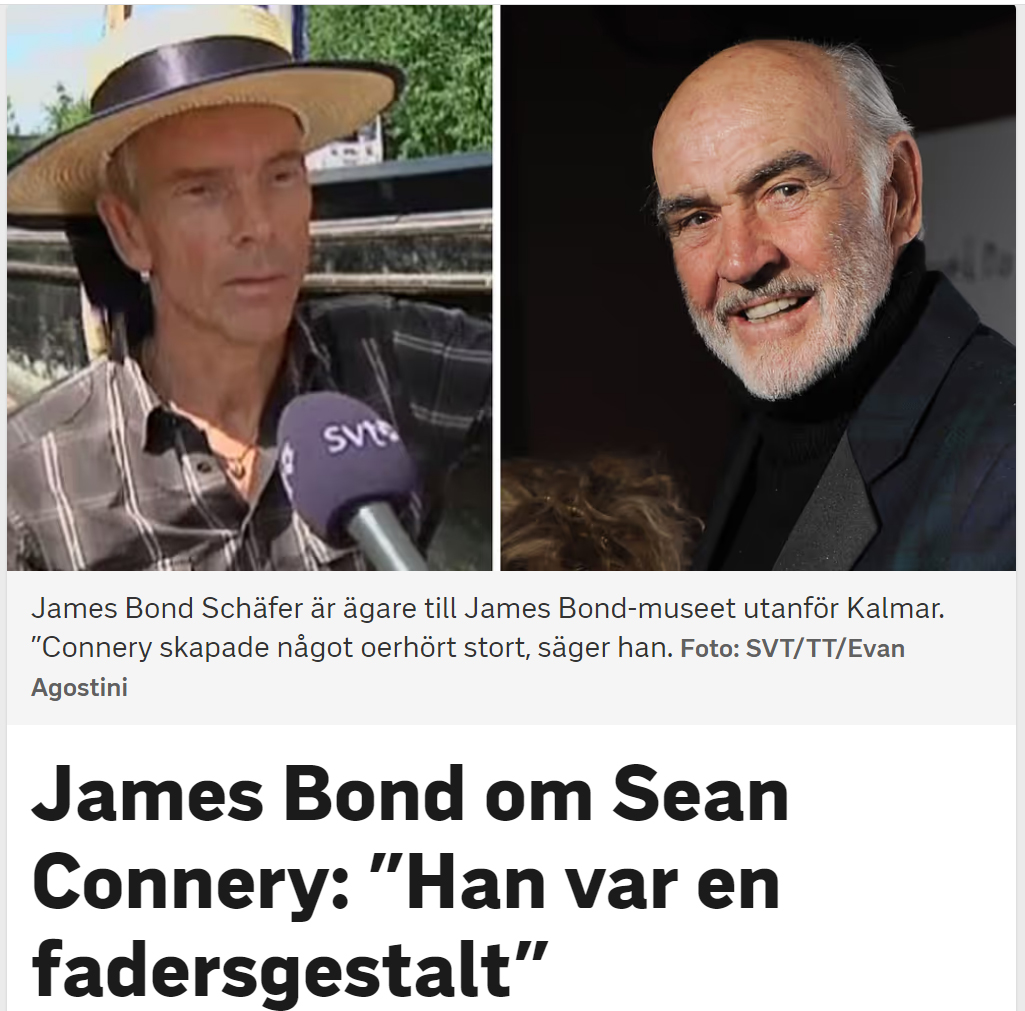 James Bond om Sean Connery: ”Han var en fadersgestalt”Skådespelaren Sean Connery gick bort under lördagen. På James Bond-museet i Nybro är det en sorgens dag. – Det är overkligt. Han var en fadersgestalt, säger Gunnar James Bond Schäfer, ägare till museet. Sean Connery är främst känd för att vara den förste skådespelaren som tog sig an rollen som James Bond på film. ”Agent 007 med rätt att döda” kom 1962 och Connery spelade Bond i ytterligare sex filmer efter det. I Nybro utanför Kalmar finns Sveriges enda James Bond-museum. – Sean Connery skapade något oerhört stort. Att på 60-talet kunna se en ensam agent som skulle rädda världen var världsunikt. Och dessutom i färg, säger Gunnar James Bond Schäfer till T – De valde Sean Connery för att han var en rå och oslipad diamant. Ian Flemming gillade honom inte från början, och sen utvecklades Bond till att bli den karaktär han har blivit. Hann du personligen träffa Sean Connery? – Ja, jag träffade honom i London på 90-talet och fick en pratstund. Han hade en enorm karisma och utstrålning. Vad kommer hända på museet under dagen? – Jag tänker öppna en flaska Dom Pérignon och skåla och säga tack för allt. Sean Connery blev 90 år.
