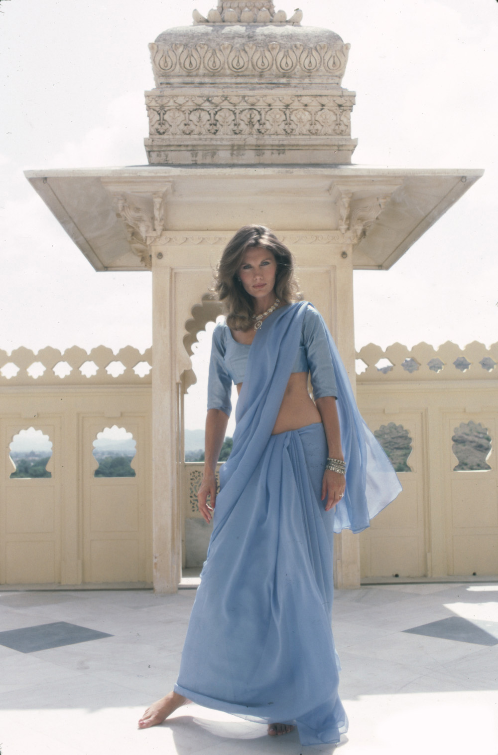 Roger Moore as James Bond with Kristina Wayborn as Magda in Octopussy Location Lake Picchola, Udaipur Taj Lake Palace. www.tajhotels.com