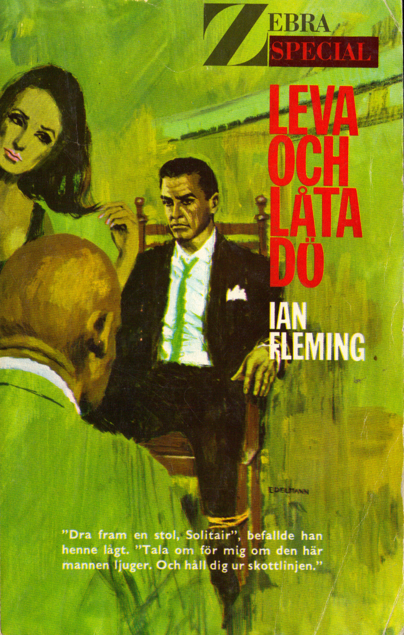 Zebra Special  "Åskbollen" ( Thunderball ) Zebra Special "Kamrat Mördare".   (From Russia With Love)Zebra Special "Leva och Låta Dö" (Live And Let Die)Zebra Special "Döden Spelar Falskt "  (Diamonds Are Forever)Zebra Special "Döden På Jamaica" ( Dr No )Zebra Special "Casino Royale"  ( Casino Royale )James Bond (Gunnar Schäfer) med världsberömda konstnären Yrjö Edelmann