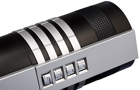 flaskan i en förpackning som påminner om en ljuddämpare till en pistol,