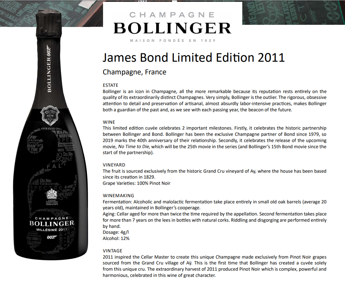 Beställ Dry Martini "Shaken not stirred" Skakad men inte rörd i eget tillverkade Martini 007 glas Champagne Bollinger has been featured as 007's Champagne of choice in some novels of Ian Fleming, as well as the movies. List of Bollinger champagnes used in