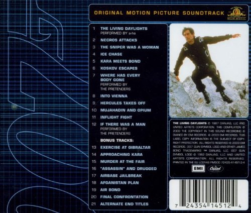 2. John Barry – Necros Attacks. 2:04 3. John Barry – The Sniper Was A Woman. 2:30 4. John Barry – Ice Chase. 4:05 5. John Barry – Kara Meets Bond. 2:47 6. John Barry – Koskov Escapes. 2:23 7. The Pretenders – Where Has Every Body Gone. 3:37 8. John Barry – Into Vienna. 2:50 9. John Barry – Hercules Takes Off. 2:17 10. John Barry – Mujahadin And Opium. 3:13 11. John Barry – Inflight Fight. 3:12 12. The Pretenders – If There Was A Man. 2:54 Bonus Tracks. 13. John Barry – Exercise At Gibraltar. 6:22 14. John Barry – Approaching Kara. 2:21 15. John Barry – Murder At The Fair. 2:22 16. John Barry – "Assassin" And Drugged. 2:43 17. John Barry – Airbase Jailbreak. 4:37 18. John Barry – Afghanistan Plan. 3:34 19. John Barry – Air Bond. 1:46 20. John Barry – Final Confrontation. 1:58 21. John Barry – Alternate End Titles. 3:20 John Barry James Bond 007 THE LIVING DAYLIGHTS Film Soundtrack CD +BONUS TRACKS