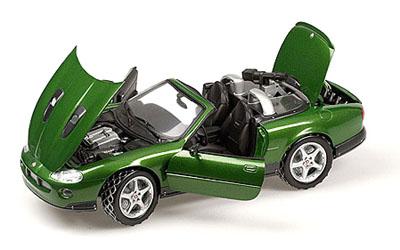 Jaguar XKR Roadster The car of choice for Zao (Bond's Nemisis) in 'Die Another Day' is a specially equiped Jaguar XKR Roadster. This 1:18 scale die-cast metal replica features rockets under the front grille - machine guns - outer door panels which lower to expose rockets - a gattling gun that raises up through removable middle section of rear tourneau cover - opening trunk to display mortars - "Spiked" tires - opening hood - opening doors - and steering wheel which turns the front wheels. Length: Approx. 10". It is packaged in a window display box that features James Bond themed graphics. Manufactured by the Beanstalk Group. Recommended Age: 8+. Price: 1995:- $ 240 |
