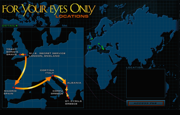 Filming locations for For Your Eyes Only (1981) James Bond 007 Achillion Palace, Gastouri, Corfu, Greece (casino scene) Achillion, Gastouri, Corfu, Greece (Casino Scene) Agios Spyridon Tower, Corfu Town, Corfu, Greece (James Bond and Melina are shopping) Balcony Terrace, Achillion Palace, Gastouri, Corfu, Greece (Bond and Melina look out over Corfu Bay at night) Bouas-Danilia Village, Corfu, Greece (Greek wedding scene - Bond meets Q at village St. Cyril's Church) Casino, Achillion Palace, Gastouri, Corfu, Greece (casino scene) Cliffs, The Old Fortress, Corfu Town, Corfu, Greece (Bond kicks Mercedes off cliff with Locque in it) Concrete Walkway, Kanoni Island, Corfu, Greece (Melina arrives in Corfu on boat) Kanoni Island, Corfu, Greece Katami Bay, Corfu, Greece (Melina visits her parents - Melina's parents on boat - Hector Gonzales kills Melina Havelock's parents) Pagi Village, Corfu, Greece (yellow Citroen 2CV car chase) Paleokastritsa Road, Bouas-Danilia Village, Corfu, Greece (yellow Citroen 2CV car chase - Bond advises Melina to take the low road) Small Harbour House, The Old Fortress, Corfu Town, Corfu, Greece (Albanian warehouse action sequence) St Cyrils' Church, Bouas-Danilia Village, Corfu, Greece (James Bond meets Q in confession box at village St. Cyril's Church) St. George's Beach, Corfu, Greece (beach buggy sequence) Stone Entrance Gate, Bouas-Danilia Village, Corfu, Greece (entrance to Gonzale's villa) The Old Fortress, Corfu Town, Corfu, Greece (Albanian warehouse action sequence) The Stone Gate, The Old Fortress, Corfu Town, Corfu, Greece (Bond shoots Locque) The Tunnels, The Old Fortress, Corfu Town, Corfu, Greece (Locque almost runs over Bond in his Mercedes) Vatonies, Corfu, Greece (near) (James Bond accelerates Lotus through the Spanish countryside) Villa Sylva, Kanoni, Corfu, Greece (Gonzale's spanish villa with swimming pool) Vlacherna Monastery, Kanoni Island, Corfu, Greece (near) (Melina arrives in Corfu on boat) |