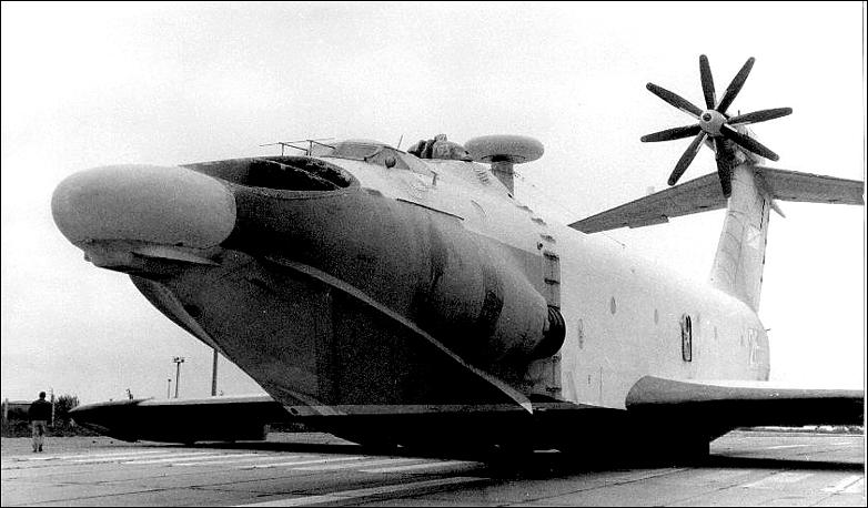 The craft used the PAR approach, with forward-mounted jets blowing under the wings to enhance lift on take-off. This engine installation consisted of two Kuznetsov NK-8-4K turbojet engines each developing 10.5 tons of thrust, while the cruise engine was an 11,000kW Kuznetsov NK-12MK turboprop. To prevent the ingestion of water and dust, the air intakes were placed high and forward - in fact in front of the canopy windshield. Rotary jet exhausts for the turbojet engines allowed the directing of the engine's exhaust under a wing (mode blow-under) or above a wing (if increase of draft in cruise flight was necessary).