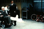 Q (DESMOND LLEWELYN, left) demonstrates the rocket cast to Bond