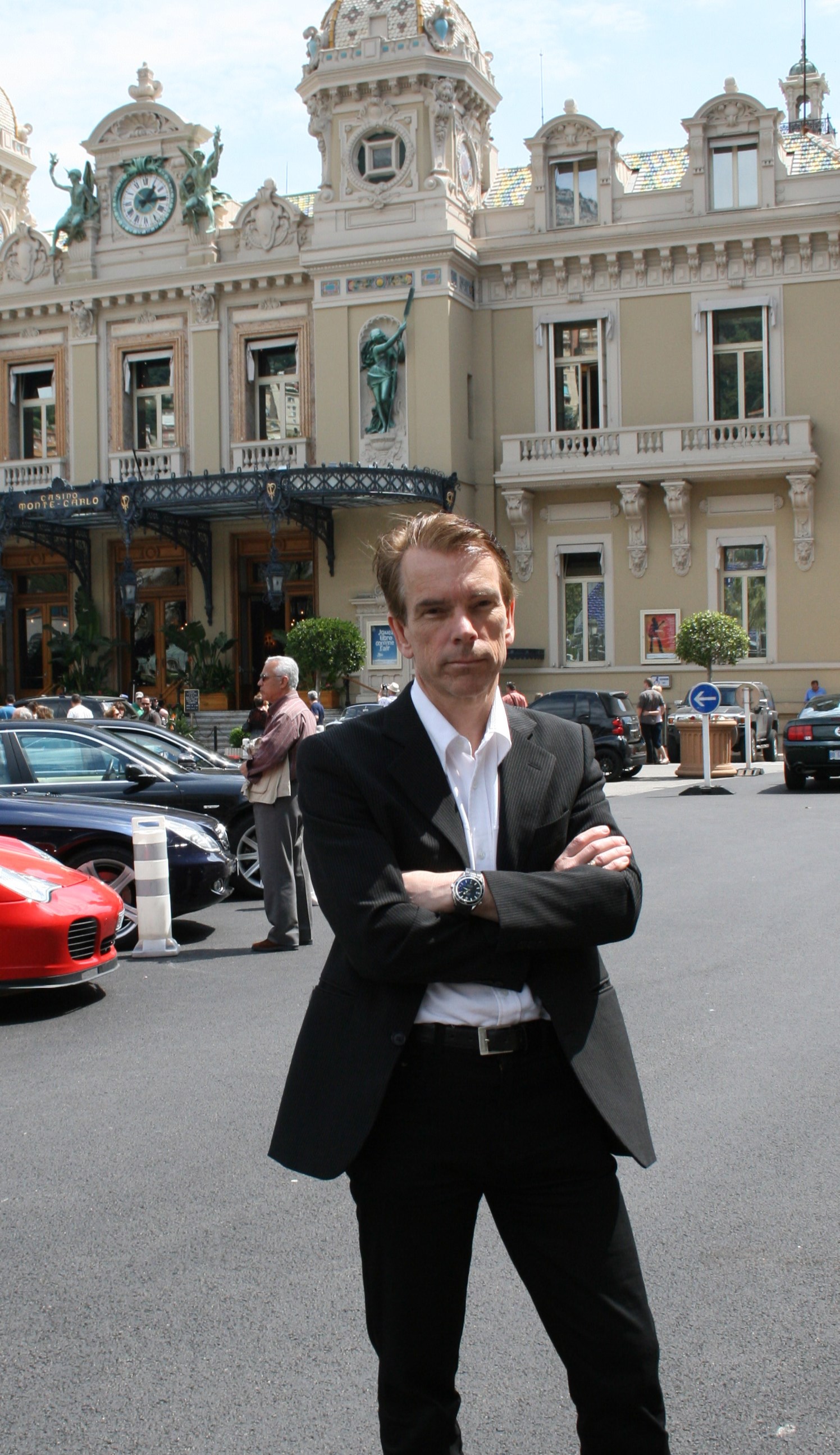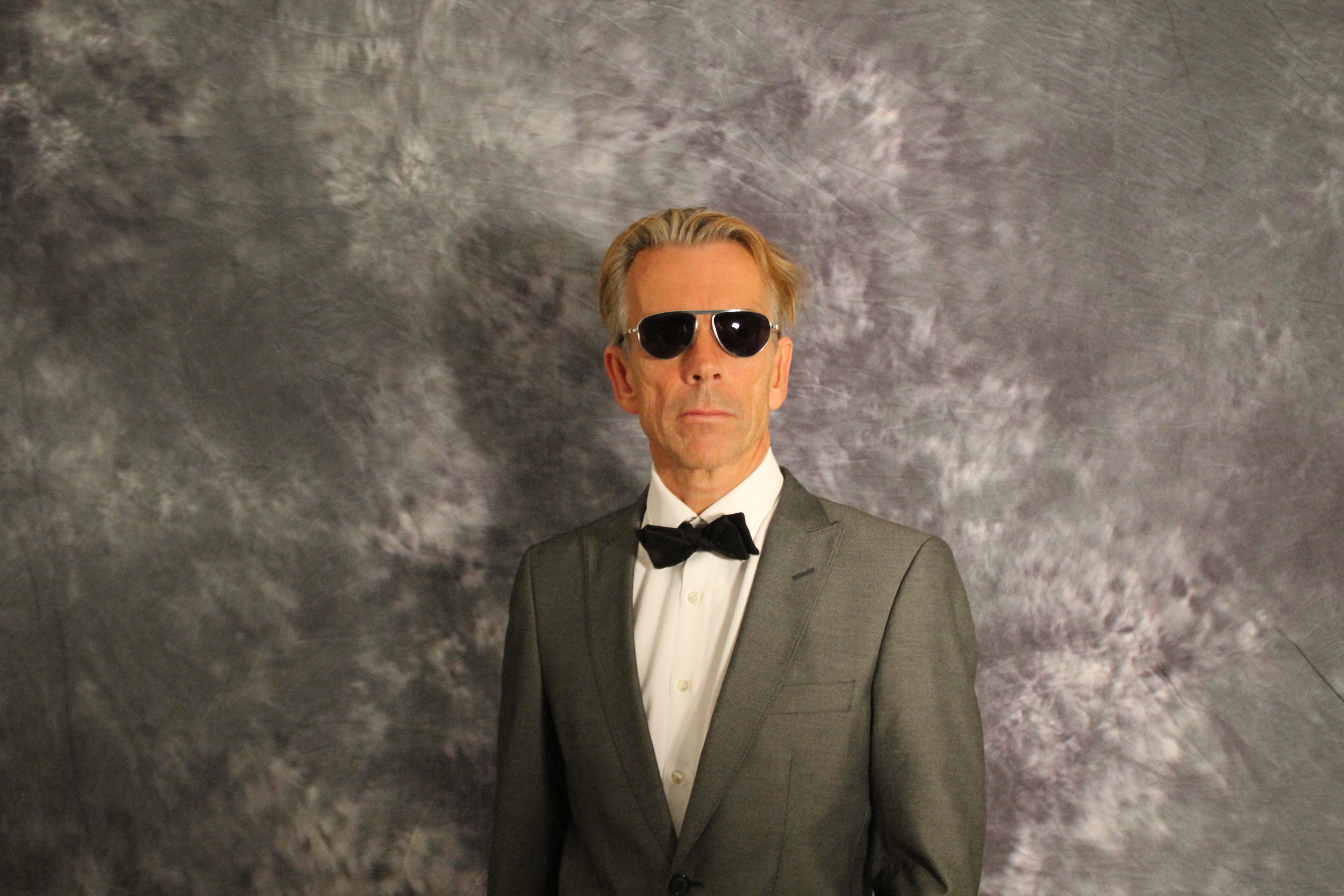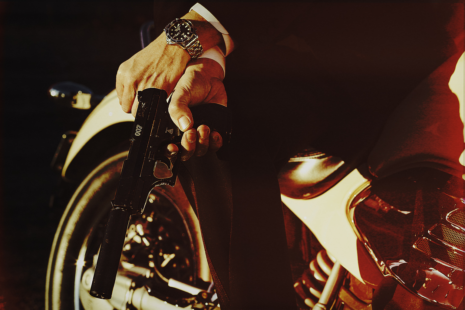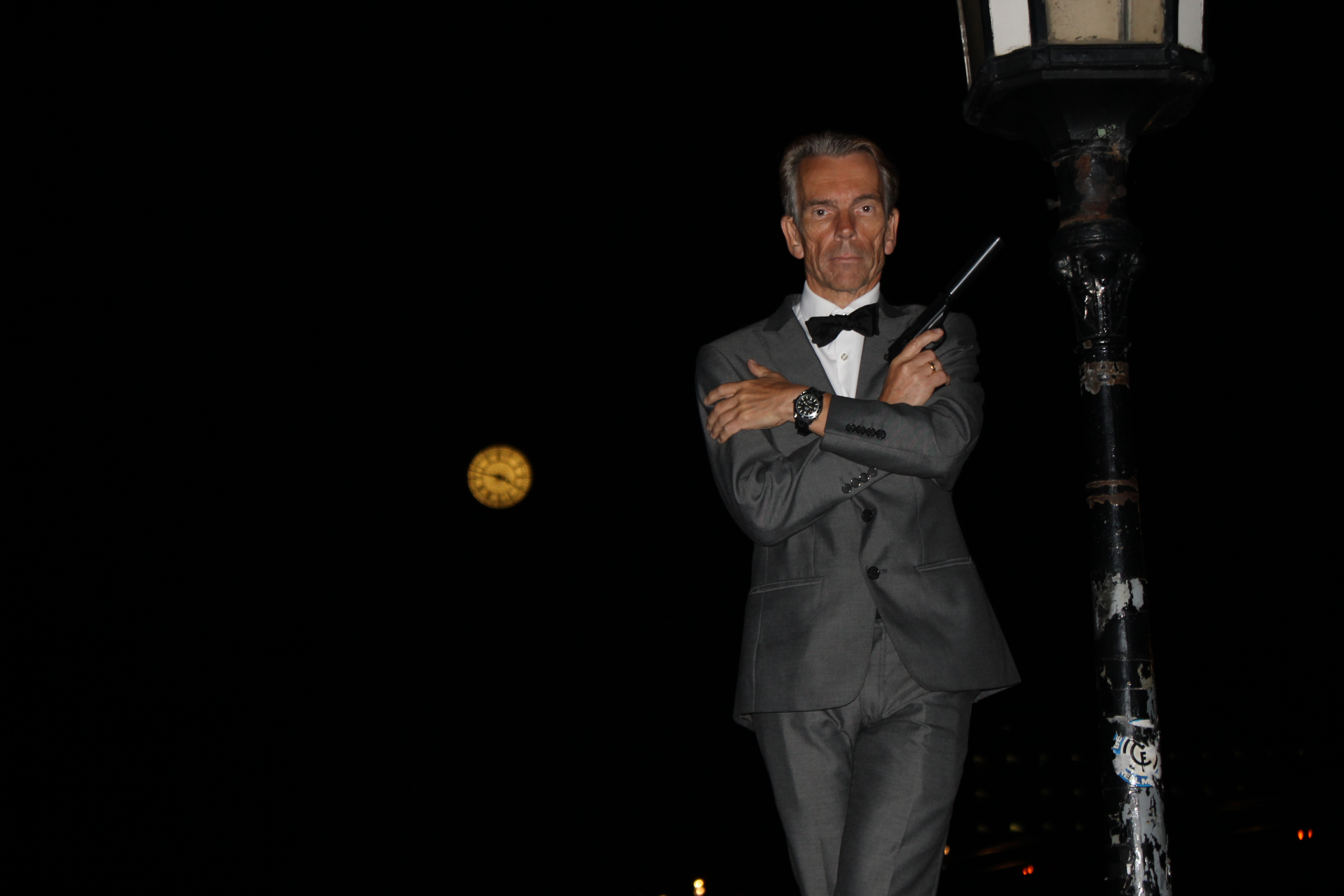 Han är ändamålsenligt klädd i smoking. Runt handleden sitter klockan