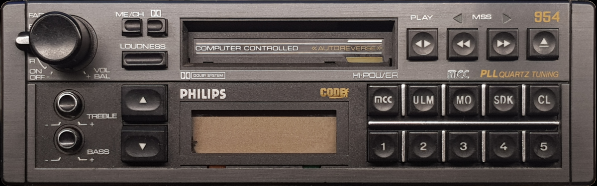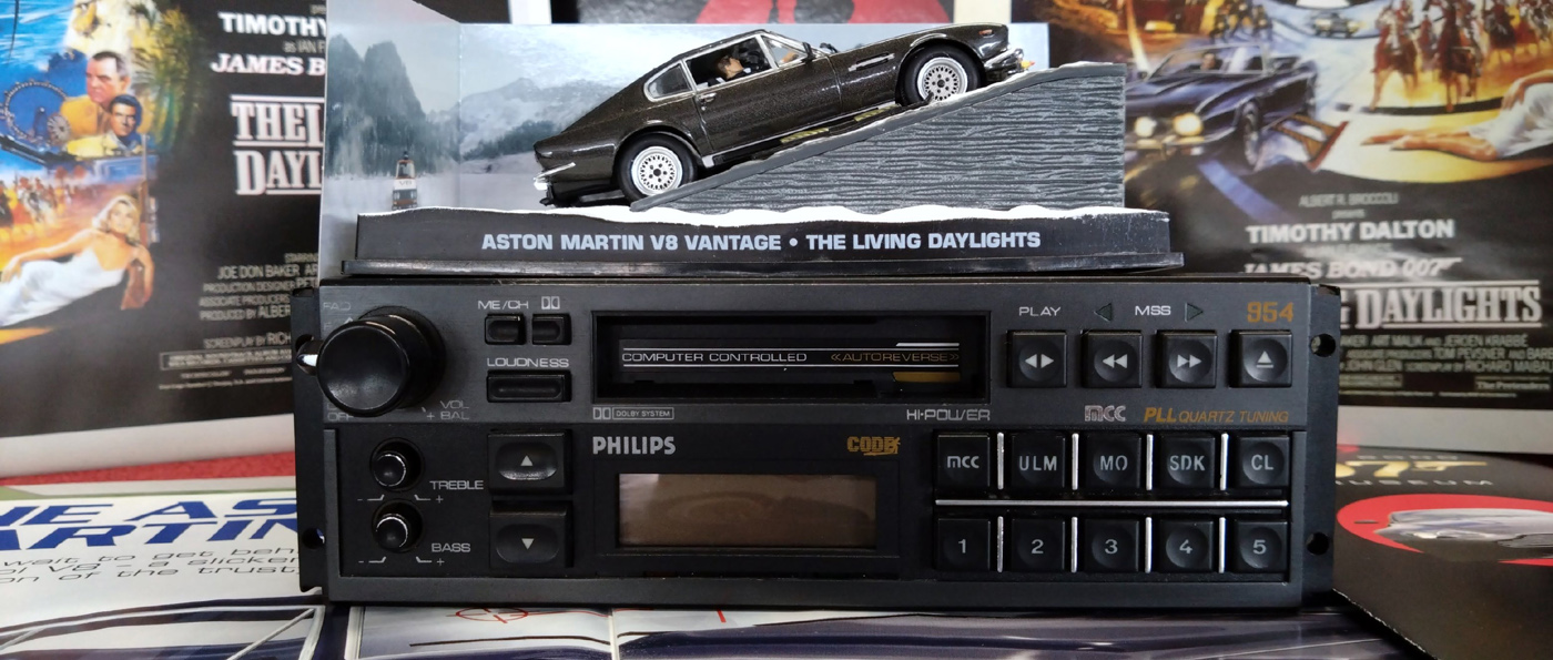 Philips DC954 the James Bond radio and casette from The Living Daylights 1987 In the movie The Living Daylights (1987), James Bond listens to a Philips DC954 car radio that has been modified by Q to receive police scanner frequencies. James Bond (Timothy Dalton) convinces Kara Milovy (Maryam D'Abo) to leave Bratislava and go to Vienna to be reunited with her boyfriend, General Koskov (Jeroen Krabbé). Bond is able to smuggle Kara and her cello out of Bratislava in his Aston Martin V8 Vantage. While on route to the border, Kara notices the strange behavior of the car radio: "You've picked up the police band". Bond replies: "There must be an atmospheric anomaly!" Kara "They're looking for a foreign car. A man and a woman." Bond "And a cello!" The MCC Power Philips DC954 car radio was produced by Philips Germany and was a top-of-the-line car radio at the time. The DC954 features an autoreverse cassette player with Music Search Systems (finds songs by stopping at the start of each song in forward or rewind mode), digital tuner, MCC (moder micro-computer electronics to automatically re-tune to the best transmitter frequency), 5-digit Philips Security Code protection, pre-set buttons, traffic info, Dolby, mono/stereo, loudness button. The Philips DC954 is currently very hard to find |