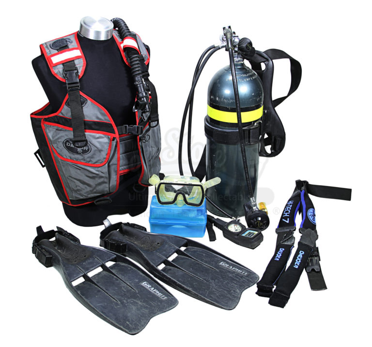 mouthpiece and a diving gauge. Displaying wear from use and storage including scratches on the tank, cracked rubber on the vest and sand on various pieces of equipment, the set remains overall in good condition. Dimensions (diving tank): 40 cm x 30 cm x 71 cm (15 ¾” x 11 ¾” x 28”)