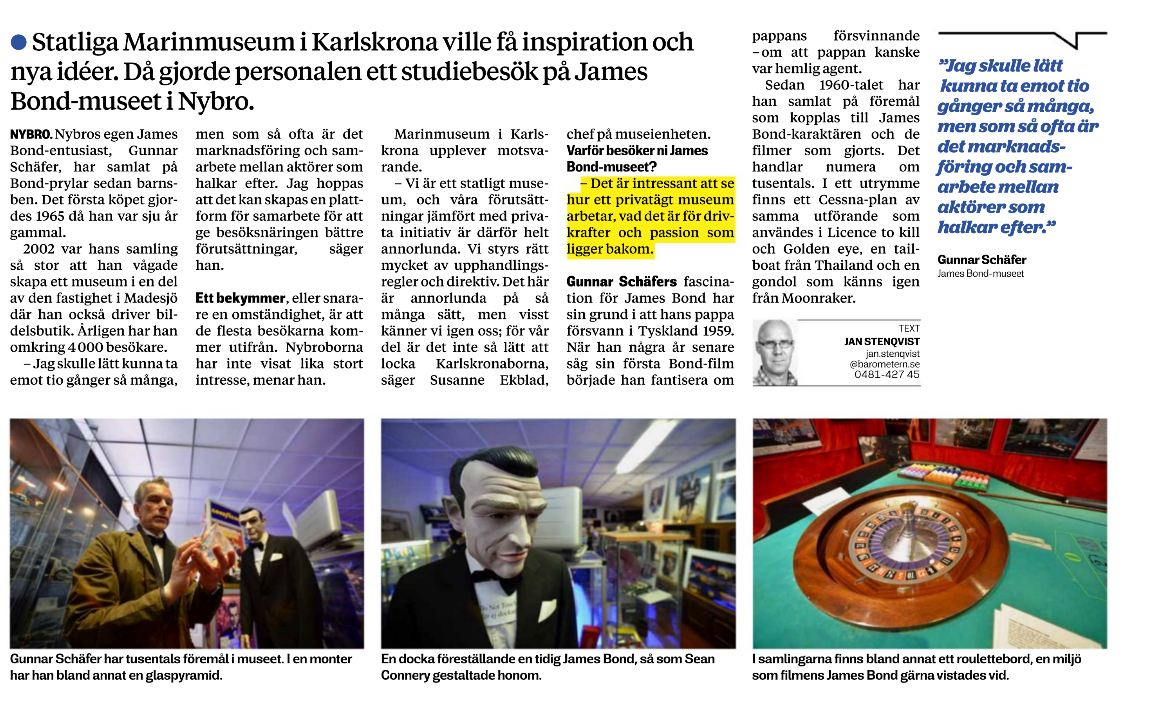 Sedan 1960-talet har han samlat på föremål som kopplas till James Bond-karaktären och de filmer som gjorts. Det handlar numera om tusentals. I ett utrymme finns ett cessna-plan av samma utförande som användes i ”Licence to kill” och ”Golden eye”, en tailboat från Thailand och en gondol som känns igen från ”Moonraker”.
