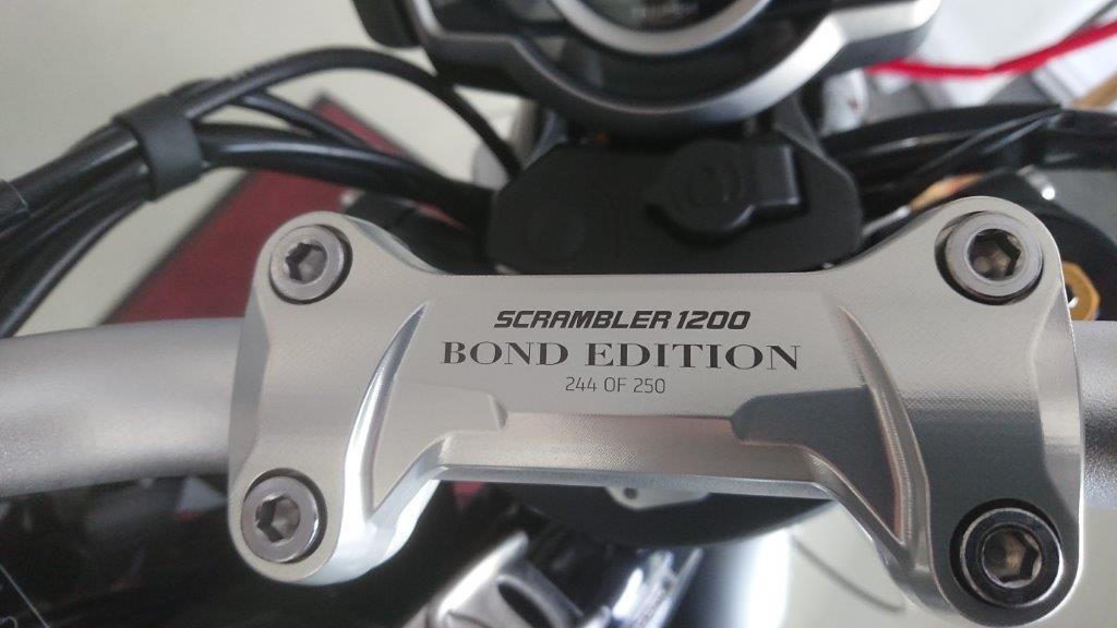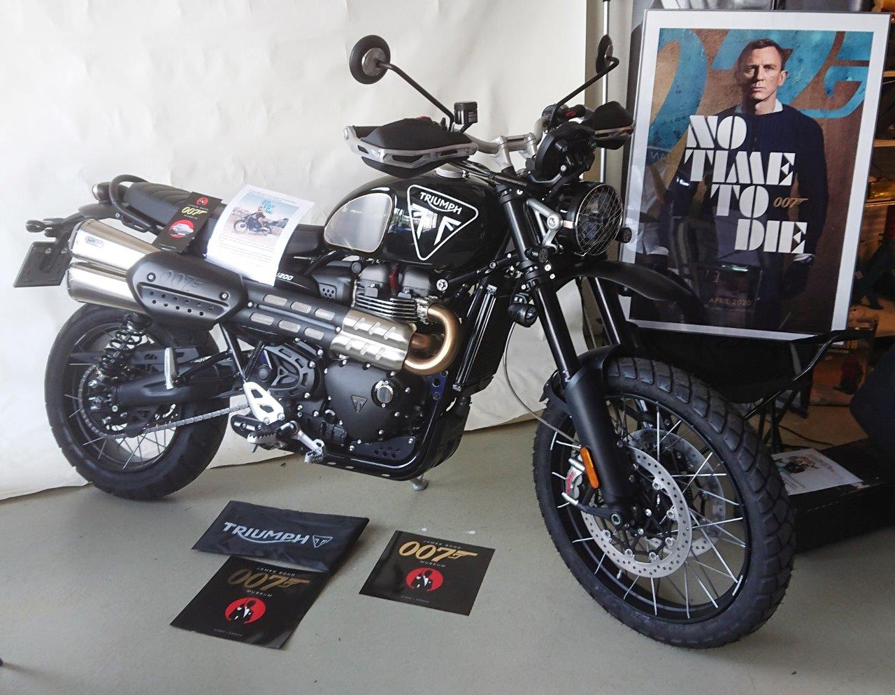 Bond 25: Vehicles: Aston Martin, Land Rover, Toyota LanCruiser, Spirit Yacht, Triumph. James Bond Craig : N.Peal, Mil-Tec gloves, Rogue Territory, Omega watch, Vuarnet sunglasses, Barton Perreira sunglasses, Sperry boat, shoes Crockett & Jones, shoes Matera, Outfit Massimo Alba ,suit Albert Thurston, braces Drake's, shoes Alexander, Olch necktie Globe-Trotter Tom Ford, Tommy Bahama shirt ,Riffe Speargun. Other characters: Le Specs sunglasses (Lashana Lynch / Nomi) Tod's Bag (Léa Seydoux / Madeleine Swann) Rouje Gabin Dress (Madeleine Swann) Paul Smith (Naomie Harris / Moneypenny) Michael Kors bag (Moneypenny) Marks & Spencer coat White parka (Villain) Chopard (Ana de Armas / Paloma) Michael Lo Sordo dress (Paloma) Emanuele Bicocchi jewelry (Dali Benssalah / Primo) L.G.R. Reunion sunglasses (Primo) ![]() Triumph produces limited edition Scrambler 1200 Bond Edition to celebrate icon British partnership.