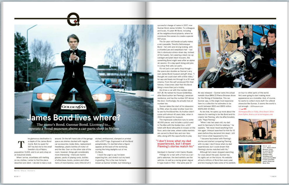 James Bond lives where? The name’s Bond. Gunnar Bond. Licensed to… operate a Bond museum above a car-parts shop in Nybro. he glamorous destination is a staple of the James Bond movie. But my quest for 007 has led me to the small Swedish city of Nybro, population 13,000, and to an auto shop on an industrial estate. When I arrive, snowflakes still melting on my clothes, I enter to find the place deserted and silent. I decide to take a look around. On the left-hand side of the garage space are shelves stacked with regular car accessories: brake disks, replacement headlamps, plastic bottles of motor oil and the like. Over on the other side of the room, however, things get considerably more interesting – there are martini glasses, packs of playing cards, bottles of aftershave, books, posters and other items of merchandise, every little bit of it etched, emblazoned, stamped or printed with a 007™ logo. Engrossed in all the Bond paraphenalia, I’m startled when a figure appears at the back of the workshop, scaring the living daylights out of me. It’s Bond. I resist the urge to say I’ve been expecting him, and stretch out my hand in greeting. This is the man formerly known as Gunnar Schäfer, but following a