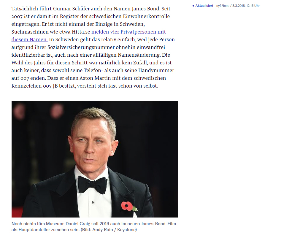 Ein «echter» James Bond Tatsächlich führt Gunnar Schäfer auch den Namen James Bond. Seit 2007 ist er damit im Register der schwedischen Einwohnerkontrolle eingetragen. Er ist nicht einmal der Einzige in Schweden; Suchmaschinen wie etwa Hitta.se melden vier Privatpersonen mit diesem Namen. In Schweden geht das relativ einfach, weil jede Person aufgrund ihrer Sozialversicherungsnummer ohnehin einwandfrei identifizierbar ist, auch nach einer allfälligen Namensänderung. Die Wahl des Jahrs für diesen Schritt war natürlich kein Zufall, und es ist auch keiner, dass sowohl seine Telefon- als auch seine Handynummer auf 007 enden. Dass er einen Aston Martin mit dem schwedischen Kennzeichen 007 JB besitzt, versteht sich fast schon von selbst. Noch nichts fürs Museum: Daniel Craig soll 2019 auch im neuen James-Bond-Film als Hauptdarsteller zu sehen sein. (Bild: Andy Rain / Keystone)
