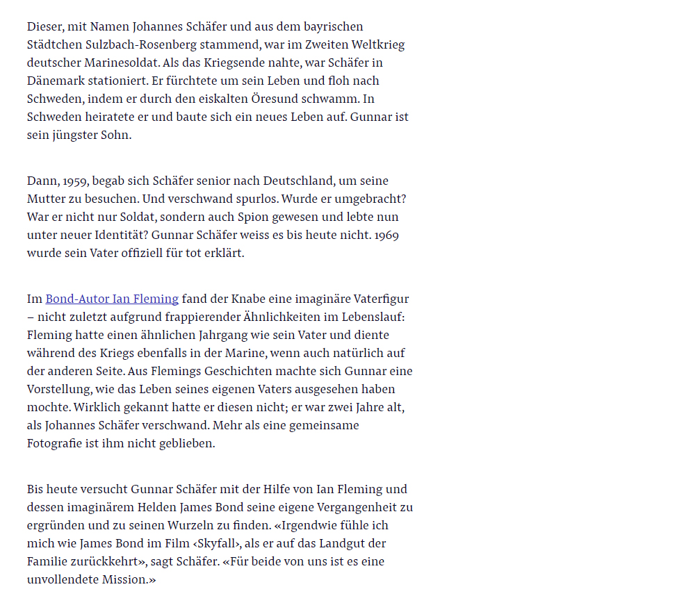 Dieser, mit Namen Johannes Schäfer und aus dem bayrischen Dann, 1959, begab sich Schäfer senior nach Deutschland, um seine Mutter zu besuchen. Und verschwand spurlos. Wurde er umgebracht? War er nicht nur Soldat, sondern auch Spion gewesen und lebte nun unter neuer Identität? Gunnar Schäfer weiss es bis heute nicht. 1969 wurde sein Vater offiziell für tot erklärt. Im Bond-Autor Ian Fleming fand der Knabe eine imaginäre Vaterfigur – nicht zuletzt aufgrund frappierender Ähnlichkeiten im Lebenslauf: Fleming hatte einen ähnlichen Jahrgang wie sein Vater und diente während des Kriegs ebenfalls in der Marine, wenn auch natürlich auf der anderen Seite. Aus Flemings Geschichten machte sich Gunnar eine Vorstellung, wie das Leben seines eigenen Vaters ausgesehen haben mochte. Wirklich gekannt hatte er diesen nicht; er war zwei Jahre alt, als Johannes Schäfer verschwand. Mehr als eine gemeinsame Fotografie ist ihm nicht geblieben. Bis heute versucht Gunnar Schäfer mit der Hilfe von Ian Fleming und dessen imaginärem Helden James Bond seine eigene Vergangenheit zu ergründen und zu seinen Wurzeln zu finden. «Irgendwie fühle ich mich wie James Bond im Film ‹Skyfall›, als er auf das Landgut der Familie zurückkehrt», sagt Schäfer. «Für beide von uns ist es eine unvollendete Mission.»
