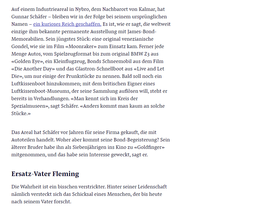 | James Bond's unfinished mission In a provincial nest in southern Sweden is the only permanent 007 museum in the world. The reason for his existence is as curious as it is touching. His name is Bond, James Bond. So you know him when he crosses the city in his open sports car and then drives up in a tuxedo at the casino. And that's how he imagines when he receives the visitor. But people of his stroke, you know, sometimes have more than one identity. It's the same with him too. His full name is Nils Gunnar Bond James Schäfer. His city: Kalmar, a southern Swedish provincial nest on the Baltic Sea. His mission: The operation of the world's only stationary museum devoted to nothing and nothing more than 007, Her Majesty's agent. A "real" James Bond In fact, Gunnar Schäfer also leads the name James Bond. Since 2007, he is registered in the register of the Swedish population control. He is not even the only one in Sweden; Search engines such as Hitta.se report four individuals with this name. In Sweden, this is relatively easy, because every person is identifiable anyway due to their social security number, even after any name change. Of course, choosing the year for this step was not a coincidence, and neither is it that both his phone number and mobile phone number end at 007. It goes without saying that he owns an Aston Martin with the Swedish registration number 007 JB. On an industrial estate in Nybro, the neighboring village of Kalmar, Gunnar Schäfer has created a curious realm - and we will continue with his original name. It is, he says, the world's only permanent exhibition of James Bond memorabilia known to him. His latest piece: an original Venetian gondola, as used in the movie "Moonraker". And lots of cars, from the toy format to the original BMW Z3 from "Golden Eye," a light aircraft, Bond's snowmobile from the film "Die Another Day," and the Glastron speedboat from "Live and Let Die," to name just a few of the showpieces call. Soon a hovercraft is to be added; He is already in negotiations with the British owner of a hovercraft museum who wants to disband his collection. "People know each other in the circle of special museums," says Schäfer. "Otherwise you hardly get to such pieces." Schäfer bought the area years ago for his company, which deals in car parts. But where does his Bond enthusiasm come from? His older brother had taken him as a seven-year-old to the cinema to "Goldfinger", and that has aroused his interest, he says. Replacement father Fleming The truth is a bit more involved. Behind his passion lies the fate of a man who is still searching for his father. This, named Johannes Schäfer and from the Bavarian town of Sulzbach-Rosenberg, was a German marine during the Second World War. At the end of the war Schäfer was stationed in Denmark. He feared for his life and fled to Sweden, swimming in the icy Öresund. In Sweden, he married and built a new life. Gunnar is his youngest son. Then, in 1959, Schäfer senior went to Germany to visit his mother. And disappeared without a trace. Was he killed? Had he not only been a soldier but also a spy and now lived under a new identity? Gunnar Schäfer does not know it yet. In 1969, his father was officially declared dead. In the Bond author Ian Fleming the boy found an imaginary father figure - not least because of striking similarities in the CV: Fleming had a vintage similar to his father and served during the war also in the Navy, albeit on the other side. From Fleming's stories, Gunnar had a vision of what his own father's life might have looked like. He really had not known this; he was two years old when Johannes Schäfer disappeared. He has not left more than a common photograph. To this day, Gunnar Schäfer, with the help of Ian Fleming and his imaginary hero James Bond, tries to fathom his own past and find its roots. "Somehow I feel like James Bond in the movie 'Skyfall' when he returns to the family estate," says Schäfer. "It's an unfinished mission for both of us." |