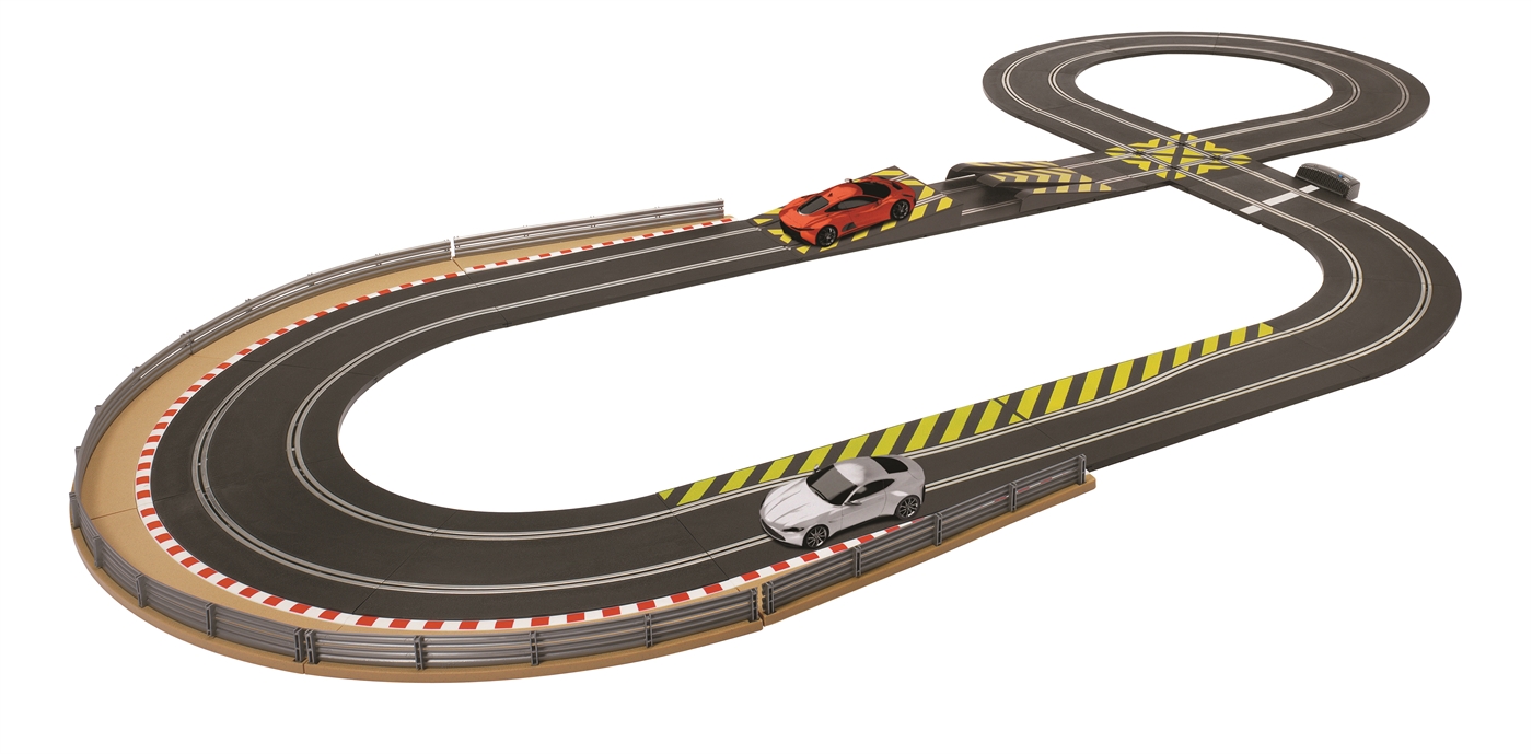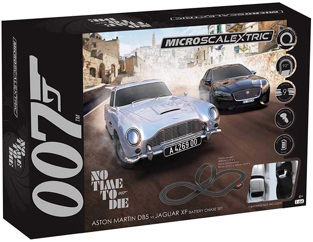 kids will always be having fun with this set as the cars The latest James Bond film, No Time to Die, is the 25th instalment of the franchise, and like previous James Bond films, No Time to Die features both classic and modern vehicles driven by the villain as well as 007 himself. This set features an Aston Martin DB5 taking on the Jaguar XF, and includes 4.08metres of track, with 9 track layouts which includes a loop-the-loop and half pipe. With speed limiting hand controllers you can be sure the kids will always be having fun with this set as the cars will be less likely to fly off the track. This set is battery operated. Turn this into a mains powered set with the new Micro Scalextric Mains Powered Track Piece (UK) here. Aston Martin, the Aston Martin Wings Logo and the model names "Vantage", "DBS", "DB5" and "DB10" are trademarks owned licensed or used by Aston Martin Lagonda Limited. All rights reserved. Jaguar and the leaper device are trademarks owned and licensed by Jaguar Land Rover Limited. James Bond materials © 1962-2020 Danjaq and MGM. Related James Bond Trademarks are Trademarks of Danjaq, LLC. All Rights Reserved.
