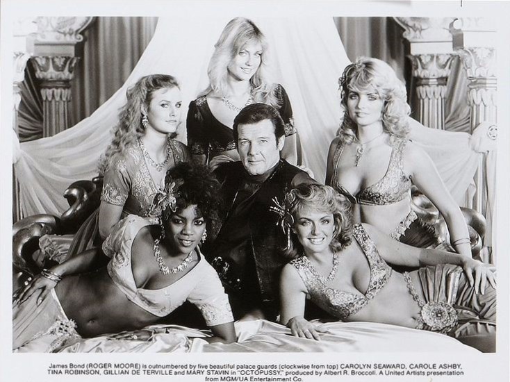 Roger Moore as James Bond. One of the Bondgirls,