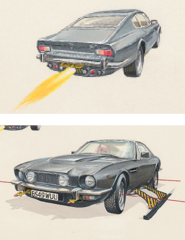 close-up during Die Another Day. The pages of Ian Fleming’s novel Goldfinger— the author’s seventh James Bond novel—are where the enduring romance between 007 and Aston Martin was born. In his bestselling 1959 book, Fleming wrote that his debonair, hard-as-nails British spy drove an Aston Martin DB3 while driving through Europe on the hunt for notorious villain Auric Goldfinger. Fleming explained that Bond’s car boasted only a few, subtle modifications to assist his work as a MI6 spy: the bumpers were reinforced and a secret compartment allowed him to hide a Colt 45 pistol. So began a love affair between a fictional character and a classic British car that’s thrived for over half a century. Although this romance began with the printed word, film affects a very special magic, and it was with the 1964 film version of Goldfinger starring Sean Connery that the iconic relationship between James Bond and Aston Martin was truly sealed. When Bond producers Albert “Cubby” Broccoli and Harry Saltzman imported Bond’s car from Fleming’s book for the film, they upgraded him to the then latest model, the DB5. It was a wise choice: the combination of Sean Connery and the DB5 was too much for audiences to resist. Here you had a new kind of film star—suave, handsome but also brutish and with a hint of rough—coupled with an extremely beautiful and utterly modern car. “Where’s my Bentley?” Bond asks Desmond Llewelyn’s Q as he’s shown his gadgets and vehicle at the start of Goldfinger. “Oh, it’s had its day, I’m afraid,” replies Q. The DB5 has been at the heart of this pairing ever since. When the current producers of the Bond films, Michael G Wilson and Barbara Broccoli, came to celebrate the series’ 50th anniversary in 2012 with Skyfall, it was the DB5 that made a storming reappearance with Daniel Craig’s Bond driving it to Scotland for the film’s explosive climax. Of course, the beauty of all Bond’s cars has been that they are always so much more than they appear. Like so many of Bond’s love interests, they are attractive on the surface, but deadly beneath the bonnet. Bond’s silver DB5 in Goldfinger had its cutting-edge modifications courtesy of production designer Sir Ken Adam, whose work on Bond and with Stanley Kubrick would soon make him a movie legend. The car had revolving number plates, which meant he could drive through France and Switzerland without alerting anyone to the presence of a foreign car. One switch would cause an oil slick; another activated machine guns on the wings of the car; yet another allowed the driver to use tyre slashers that extended from the front wheels; and hidden in the gear stick was a button to activate the passenger ejector seat.