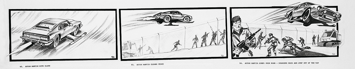 The original storyboard showing the Aston Martin V8 Vantage Volante executing a perfect ascent over a fence and soldiers in The Living Daylights
