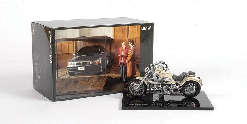 LIMITED EDITION Tomorrow Never Dies James Bond BMW R1200 C Motorcycle Cruiser (1997). 1/18 scale die-cast metal with plastic parts. Made exclusively for BMW. Features include movable front handlebars, spring suspension, fold-up rear seat, synthetic rubber tires with wire wheels, and authentic detailing. Mounted on a 3/8" black lucite base which features the Tomorrow Never Dies movie logo. Packaged in an outer box which features photos from the movie, the movie logo, and the BMW logo. Mint in mint (C-10) box. Very scarce.