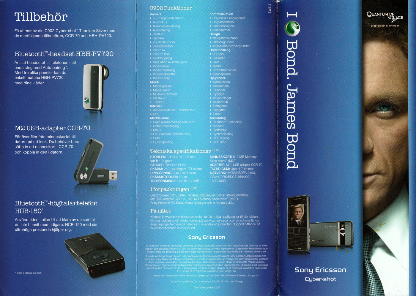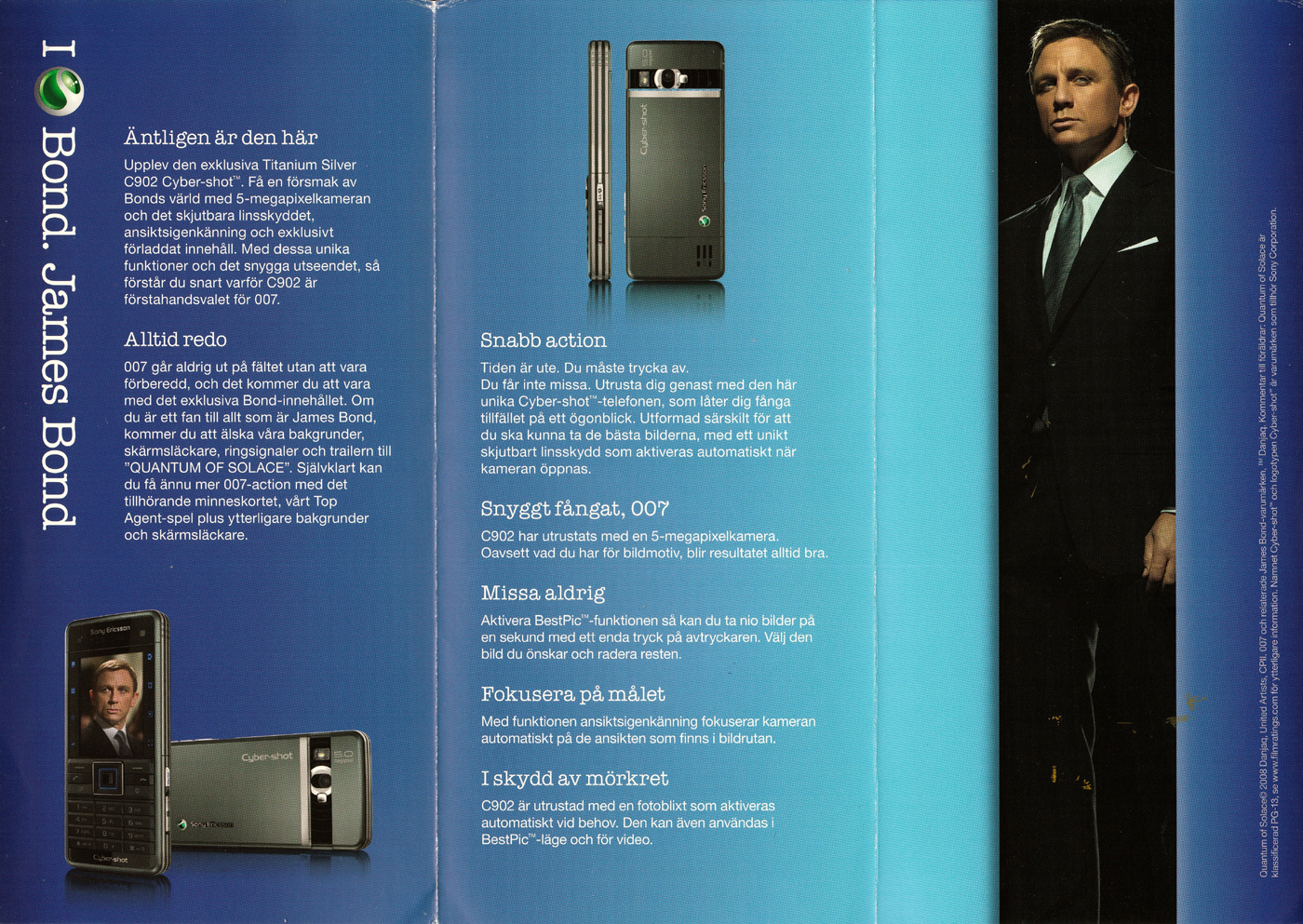 Sony Ericsson is launching a limited edition Titanium silver C902 Cyber-shot™phone as used by James Bond in the eagerly awaited QUANTUM OF SOLACE partner which will be released worldwide November 2008. The new mobile phone will make sure you are ready for any challenge, immersing you into the world of a secret agent with interactive 007 content and a spy-style game. www.sonyericsson.com/bond
