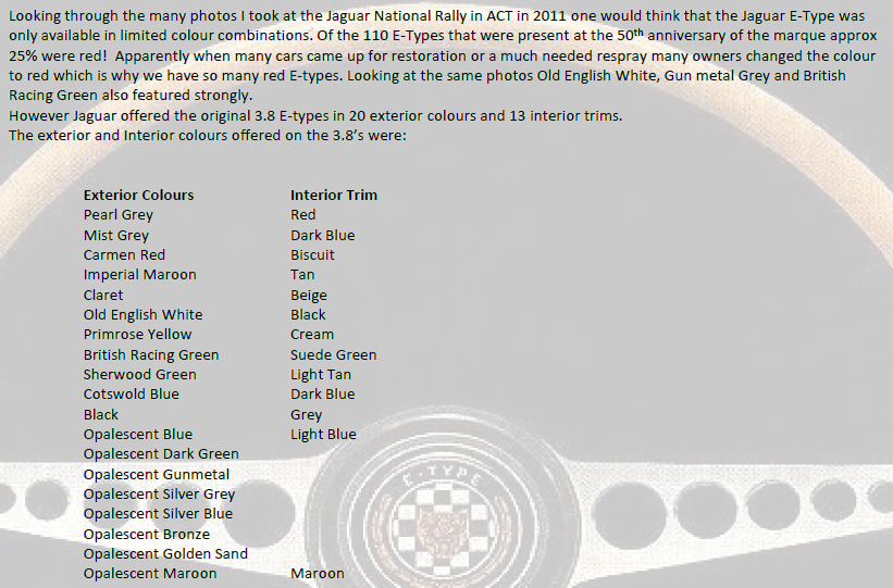 EType.pdf all facts about Jaguar E-Type Looking through the many photos I took at the Jaguar National Rally in ACT in 2011 one would think that the Jaguar E-Type was only available in limited colour combinations. Of the 110 E-Types that were present at the 50th anniversary of the marque approx 25% were red! Apparently when many cars came up for restoration or a much needed respray many owners changed the colour to red which is why we have so many red E-types. Looking at the same photos Old English White, Gun metal Grey and British Racing Green also featured strongly. However Jaguar offered the original 3.8 E-types in 20 exterior colours and 13 interior trims. The exterior and Interior colours offered on the 3.8’s were