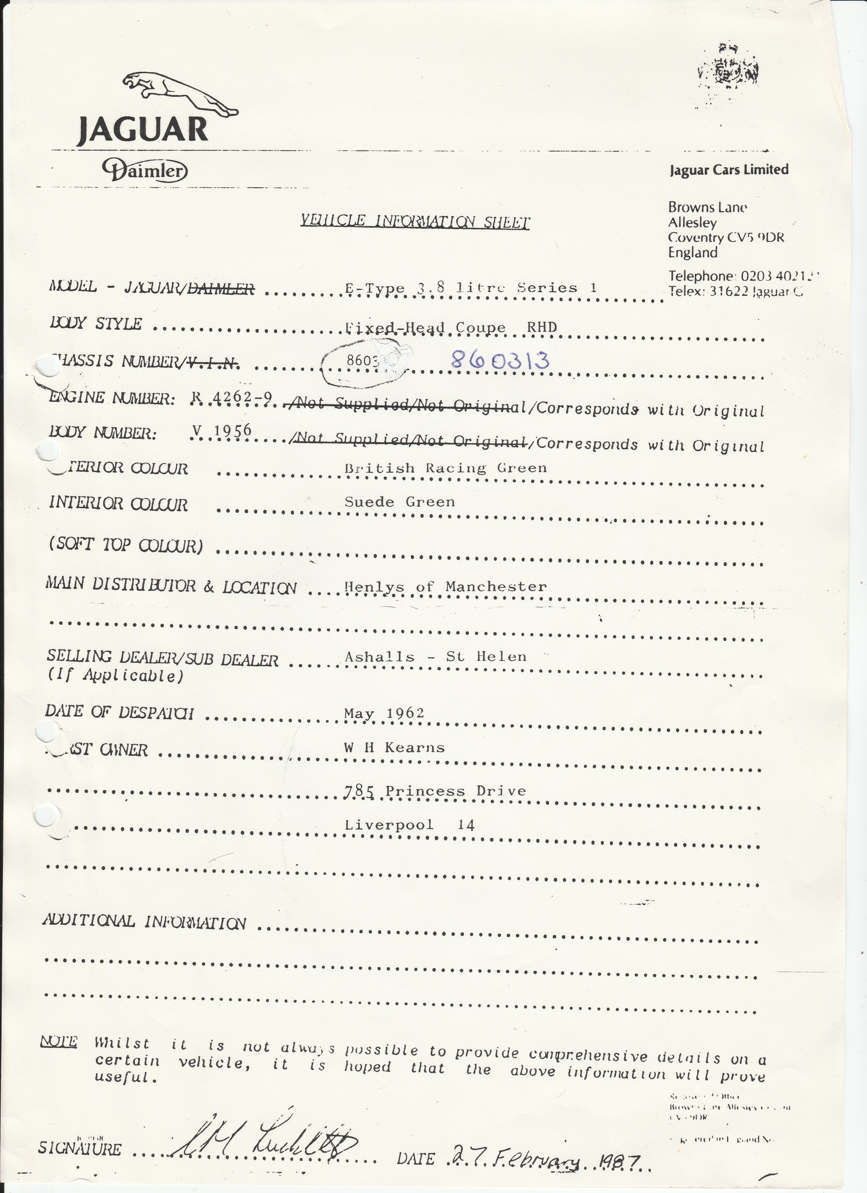 Distributor: Henlys of Manchester Date of Despatch: May 1962 Owner: Jaguars