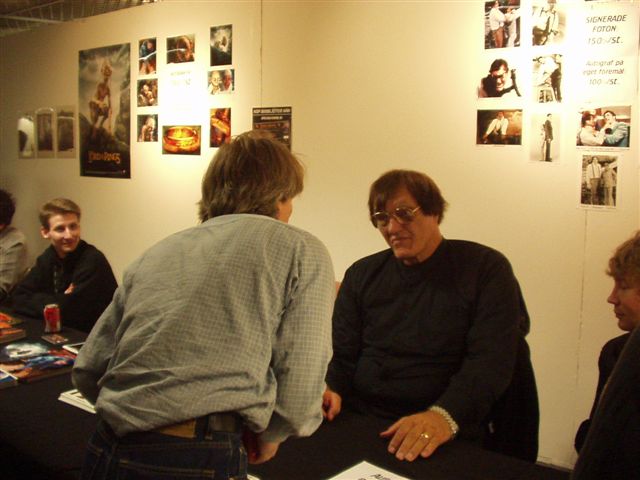 Gunnar Bond James Schäfer talk to Richard Kiel (Jaws) in Pinewood studios 21/11-2004 and given him a Jaws plate in graal gift from James Bond 007 Museum in Sweden, Nybro. design by Robert Petersson Triberga Öland.