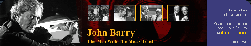 Composer John Barry, famous for his work on Born Free, Out of Africa and the James Bond films, has died in New York of a heart attack aged 77.Born John Barry Prendergast in 1933, the York-born musician first found fame as leader of the John Barry Seven. His arrangement of Monty Norman's James Bond theme led to him composing scores for 11 films in the series, among them Goldfinger and You Only Live Twice. His work saw him win five Oscars, while he received a Bafta fellowship in 2005. His most recent film score featured in the 2001 war thriller Enigma, while a musical version of Brighton Rock, created with lyricist Don Black, had its London premiere in 2004. Played by: John Barry - The Living Daylights 1987Description: John Barry, the man behind most Bond musical scores, makes a brief cameo appearance as the conductor of Kara's concert at the end of the movie at the Volksoper house in Vienna.