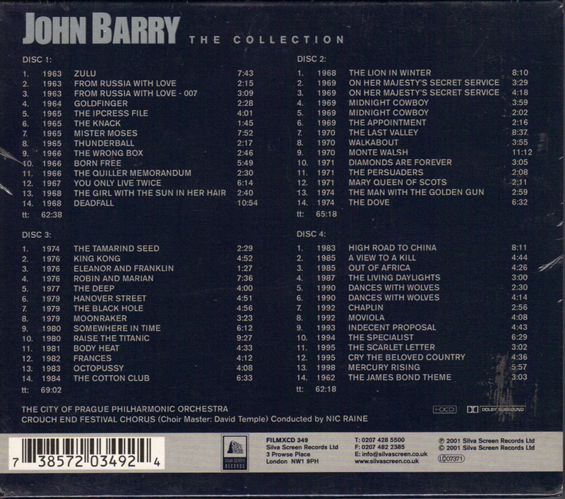 JOHN BARRY The Collection 40 years of film music CD 4 cd set-56 tracks-250 min music 4 cd set-56 tracks-250 min music ![]() Tracklisting: CD 1: 01. Zulu - Theme / Isandhlwana (7:43) 02. From Russia With Love - Main Title (2:15) 03. From Russia With Love - 007 (3:09) 04. Goldfinger (2:29) 05. Ipcress File, The (4:02) 06. Knack, The (1:47) 07. Mr. Moses - Suite (7:52) 08. Thunderball (2:17) 09. Wrong Box, The (2:46) 10. Born Free - Main Theme / Lions At Play (5:50) 11. Quiller Memorandum - Wednesday's Child (2:30) 12. You Only Live Twice - Mountains And Sunsets / The Wedding / You Only Live Twice (6:14) 13. Girl With The Sun In Her Hair, The (2:42) 14. Deadfall - Romance For Guitar And Orchestra (10:54) CD 2: 01. Lion In Winter, The - Main Title / Eleanor's Arrival / We'Re All Jungle Creatures The City of Prague Philharmonic / Crouch End Festival Chorus / Nic Raine 8:14) 02. On Her Majesty's Secret Service - We Have All The Time In The World (3:29) 03. On Her Majesty's Secret Service - Escape From Piz Gloria / The Ski Chase (4:20) 04. Midnight Cowboy (3:59) 05. Midnight Cowboy - Florida Fantasy (2:04) 06. Appointment, The (2:19) 07. Last Valley - Suite (8:37) 08. Walkabout - Back To Nature (3:55) 09. Monte Walsh - Suite (11:12 10. Diamonds Are Forever (3:05) 11. Persuaders, The - Synth. Version Mark Ayres 2:10) 12. Mary, Queen Of Scots - Vivre Et Mourir (2:14) 13. Man With The Golden Gun - Slow Boat From China / Nick Nack / The Man With The Golden Gun (2:59) 14. Dove, The - Suite (6:32) CD 3: 01. Tamarind Seed, The - Play It Again The City of Prague Philharmonic / Crouch End Festival Chorus / Nic Raine 2:29) 02. King Kong (1976) (4:53) 03. Eleanor And Franklin (1:28) 04. Robin And Marian (7:38) 05. Deep, The (4:02) 06. Hanover Street - Main Theme (4:51) 07. Black Hole, The (4:57) 08. Moonraker (3:25) 09. Somewhere In Time (6:13) 10. Raise The Titanic - Suite (9:28) 11. Body Heat (4:34) 12. Frances (4:13) 13. Octopussy - All Time High (Edit) (4:09) 14. Cotton Club, The (6:34) CD 4: 01. High Road To China - Suite The City of Prague Philharmonic / Crouch End Festival Chorus / Nic Raine 8:13) 02. View To A Kill - Wine With Stacey / Fanfare / Snow Job (4:46) 03. Out Of Africa (4:28) 04. Living Daylights, The - Koskov Escapes / Hercules Take Off (3:02) 05. Dances With Wolves - The John Dunbar Theme (2:30) 06. Dances With Wolves - The Buffalo Hunt (4:15) 07. Chaplin - Main Theme (2:58) 08. Moviola (4:08) 09. Indecent Proposal - Main Theme (4:43) 10. Specialist, The - Suite (6:29) 11. Scarlet Letter, The - Love Theme (3:04) 12. Cry The Beloved Country (4:36) 13. Mercury Rising - The Story Ends (5:57) 14. Dr. No-The James Bond Theme (Symphonic) (3:03) 0000349FCD JOHN BARRY The