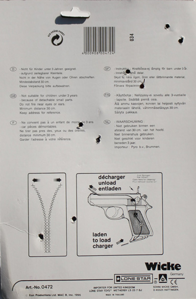 PPK 7,65 mm out of stock(Dr. No - Tomorrow Never Dies) and QUANTUM OF SOLACE Gadget: Walther PPK Bond's classic gun, the Walther PPK is introduced in Dr. No when 007's Beretta is replaced by Major Boothroyd, the armourer of the secret service, after a nasty incident when it jammed. Ever since, it has become legendary as the weapon of a secret agent. It's small size with a flat design make it ideal for concealment and the 7.65mm calibre with a 6 round magazine pack a powerful punch. The PPK was introduced in the early 1930's and was initially marketed as a pistol for the German "Criminal Police" (undercover detectives). Ian Fleming chose it as Bond's weapon after consulting with a weapons expert named Boothroyd. The Walter PPK has been Bond's weapon of choice since the Dr No mission. However Bond had previously been using a Berretta, which was not up to MI6 standards. The PPK has saved Bond's life on a countless number of occasions. The first victim to the PPK, and Bond's trigger finger was