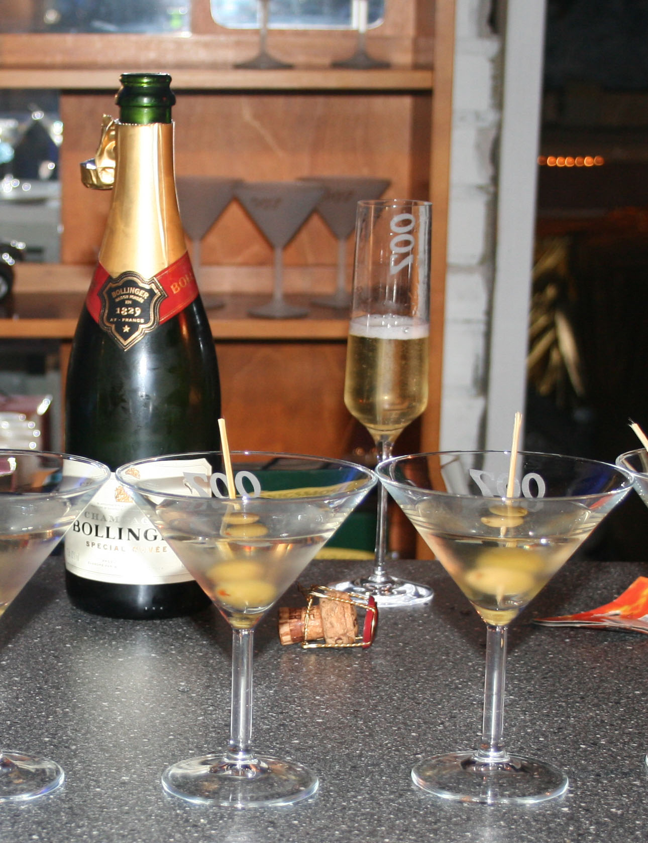 Kvällen började med en Dry Martini "Shaken not stirred " Blandad som Vesper: Även ett glas Champagne Bollinger dracks det senare under kvällen, med 007 signerade champagne glas och 007 signerade Dry Martini glas ![]() Skakad men inte rörd Egentligen börjar hela eländet i den allra först boken – Casino Royal. I kapitel 7 sitter Bond tillsammans med Felix Leiter i en bar. Det är då vår hjälte beställer en Vodka Martini, skakad men inte rörd. Men det är inte vilken Martini som helst. Den skall bestå av följande ingredienser: