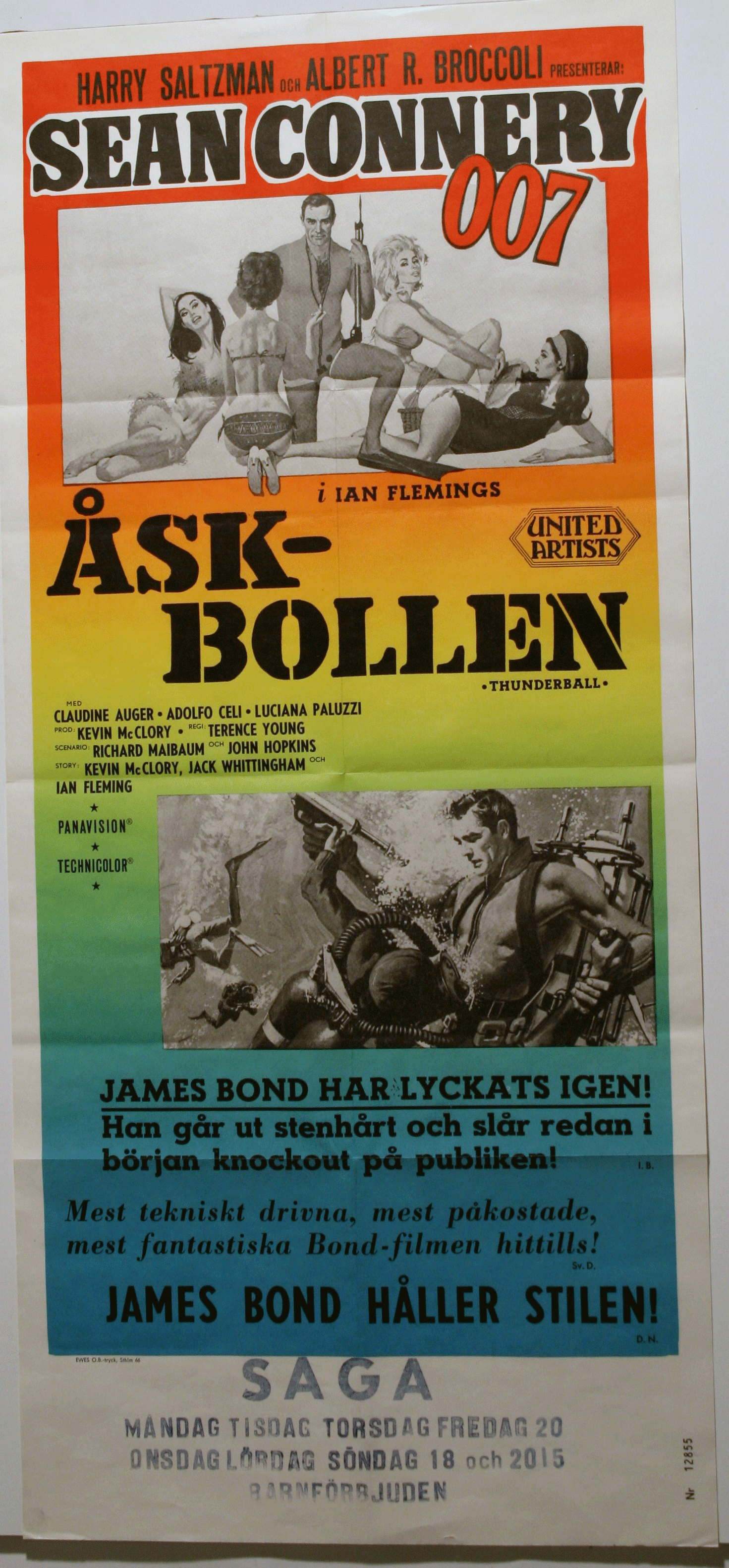 1965 ÅSKBOLLEN. Original Poster THUNDERBALL 1966 32x64cm-Åskbollen/Thunderball Poster 32x64cm FN INSERT 1966 SeanConnery,ClaudineAuger Nr:007-70070