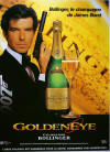 GoldenEye, 1995 United Artists, U.S. GoldenEye/ Bollinger promotional poster 31½x23½in. (80x59.7cm.) James Bond, legendary hero of fiction and film, is devoted to the Crown and to his cup of Bollinger Champagne. Just as Bollinger has been awarded the Royal Warrant by seven British monarchs since 1884, so has Bond pledged his loyalty to Bollinger. For more than four decades - since Ian Fleming penned his first James Bond, Agent 007 thriller in 1953 - Bond has enjoyed his Bollinger Champagne. Continuing the tradition, Bollinger Champagne is featured in the 1995 Bond saga, GoldenEye. This film is the 18th film to be based on Fleming's spy novels and the seventh in which Bollinger Champagne has been featured. Following a furious car chase about 30 minutes into the film, Bond, played by actor Pierce Brosnan, is asked what he does for relaxation by a woman psychiatrist sent by his boss to evaluate him. In response, Bond presses a button on his Aston Martin's dashboard to reveal a secret refrigerated compartment cradling a frosty bottle of Bollinger Grande Annee 1988 and two glasses. Smiling impishly, he kisses her and pours her a class.In discussing the film, Guy Bizot, export director of Bollinger Champagne and great-nephew of famed Champagne widow Lily Bollinger, said, "Great taste is always in great taste. Many people think of Bollinger as Champagne's most traditional house. While it's true we emulate the old-fashioned practices that enable us to create great hand-crafted wines, we are also very much in the 20th century. What could be more stylishly up-to-date than James Bond?" Bollinger Champagne was thrilled that the Broccoli production team