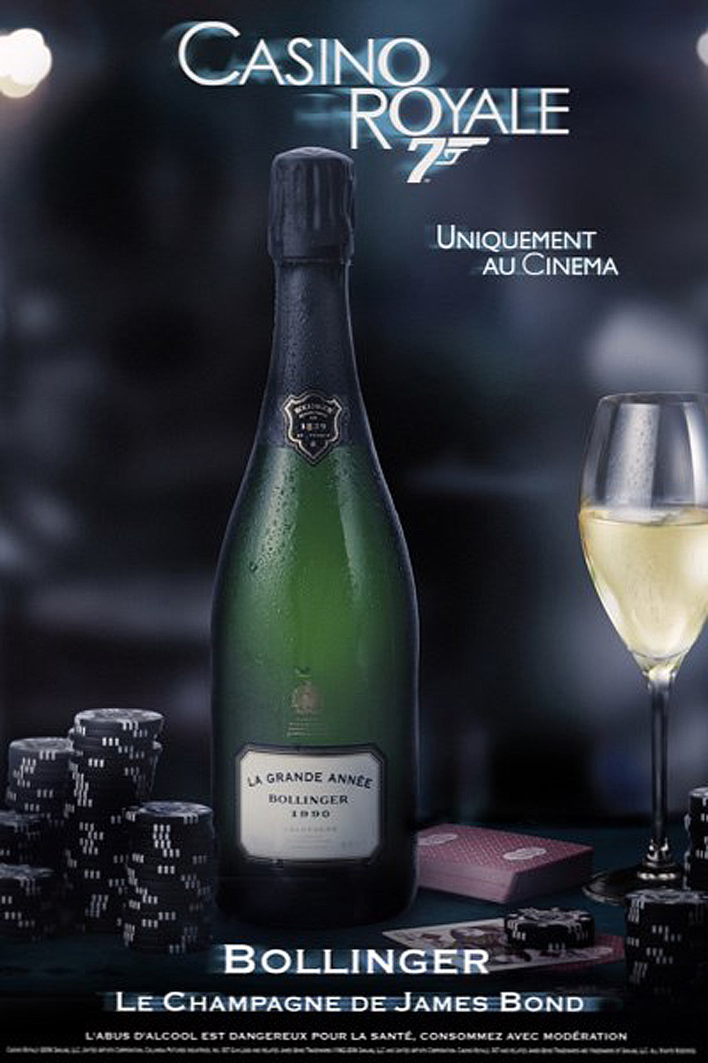 Champagne Bollinger LA GRANDE ANNÈE BOLLINGER 1990 THE OFFICIAL CHAMPAGNE BOLLINGER POSTER OF JAMES BONDS CASINO ROYALEChampagne Bollinger LA GRANDE ANNÈE BOLLINGER 1990 Bollinger bénéficie du Royal Warrant de la cour britannique depuis