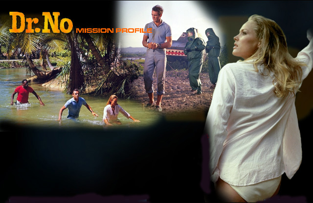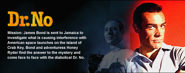 Mission James Bond is sent to Jamaica to investigate what is causing interference with American space launches on the island of Crab Key. Bond and adventuress Honey Ryder find the answer to the mystery and come face to face with the diabolical Dr. No. Review: The one that started it all. Most of the elements were introduced here: Felix Leiter, M, Moneypenny, and Bond's womanizing. The plot was simple and the movie was very low-key and down to earth; there were no Q gadgets to save the day, only Bond's cunning and intuition. This made it a more realistic film and more like Fleming's novels. Perhaps the best scene was when the tarantula was crawling up Bond's arm. Enhanced by John Barry's stunning score, you could actually see the fear on Bond's face as the spider got closer and closer to his neck. Another aspect of the film that was very well done was Bond's killing