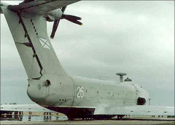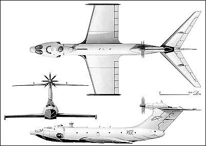 The craft used the PAR approach, with forward-mounted jets blowing under the wings to enhance lift on take-off. This engine installation consisted of two Kuznetsov NK-8-4K turbojet engines each developing 10.5 tons of thrust, while the cruise engine was an 11,000kW Kuznetsov NK-12MK turboprop. To prevent the ingestion of water and dust, the air intakes were placed high and forward - in fact in front of the canopy windshield. Rotary jet exhausts for the turbojet engines allowed the directing of the engine's exhaust under a wing (mode blow-under) or above a wing (if increase of draft in cruise flight was necessary).