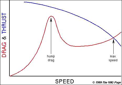 The maximum drag often occurs well before the take-off speed - an odd phenomenon that happens because the craft needs to get onto plane (climbing its own bow wave) before it can go faster. In this graph the drag (red line) is shown in relation to speed, with the blue line showing the thrust of the engine. The theoretical maximum speed that this craft can reach is the point where the lines cross. Significantly, the hump drag may be as much as 2 to 3 times higher than the drag in cruise flight.