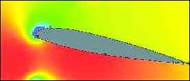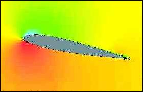 These images of the pressure distributions around wings clearly show the ground effect. The red colour shows the area of high pressure, while green is ambient pressure and blue is low pressure. The red area is relatively small under the wind in free air...