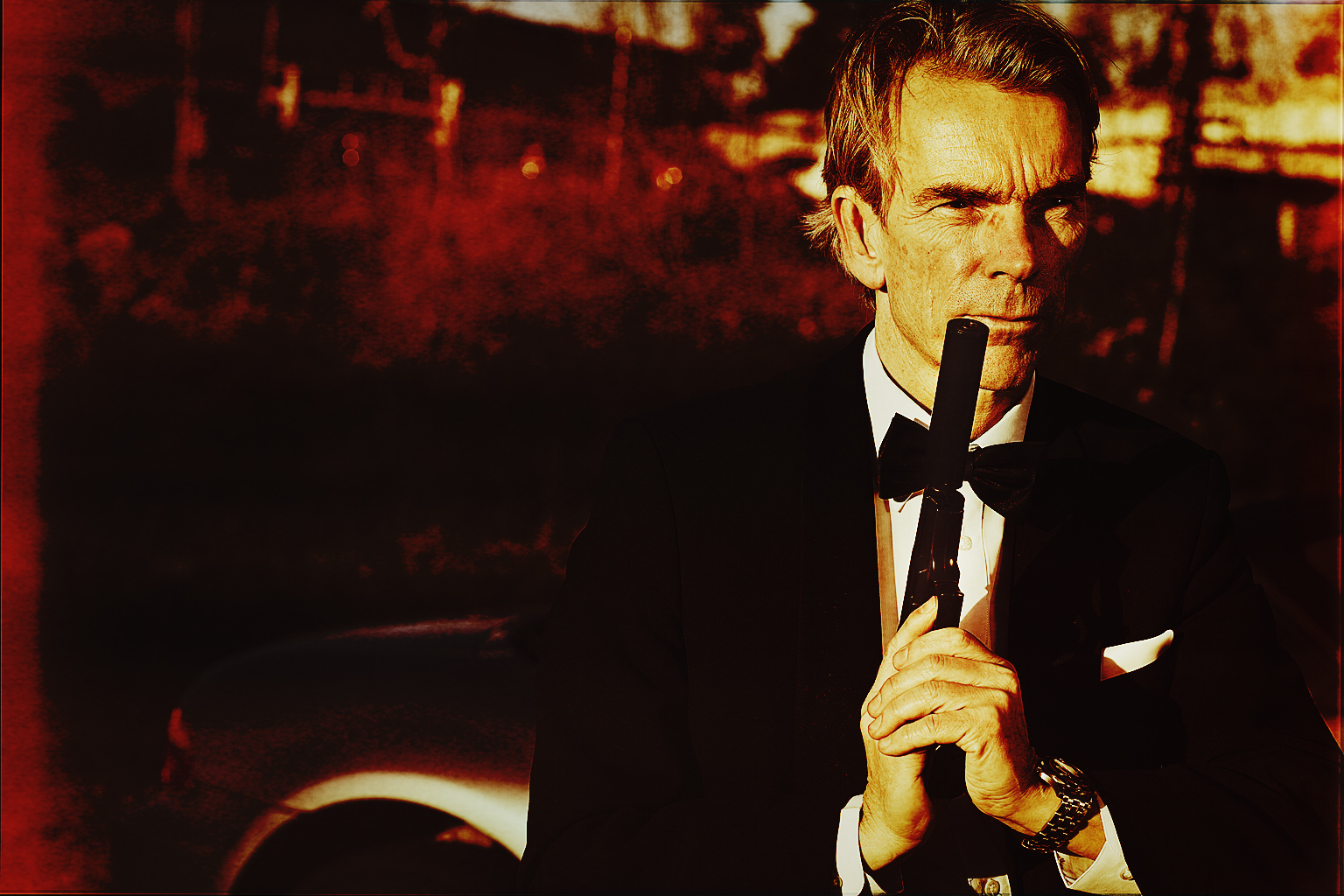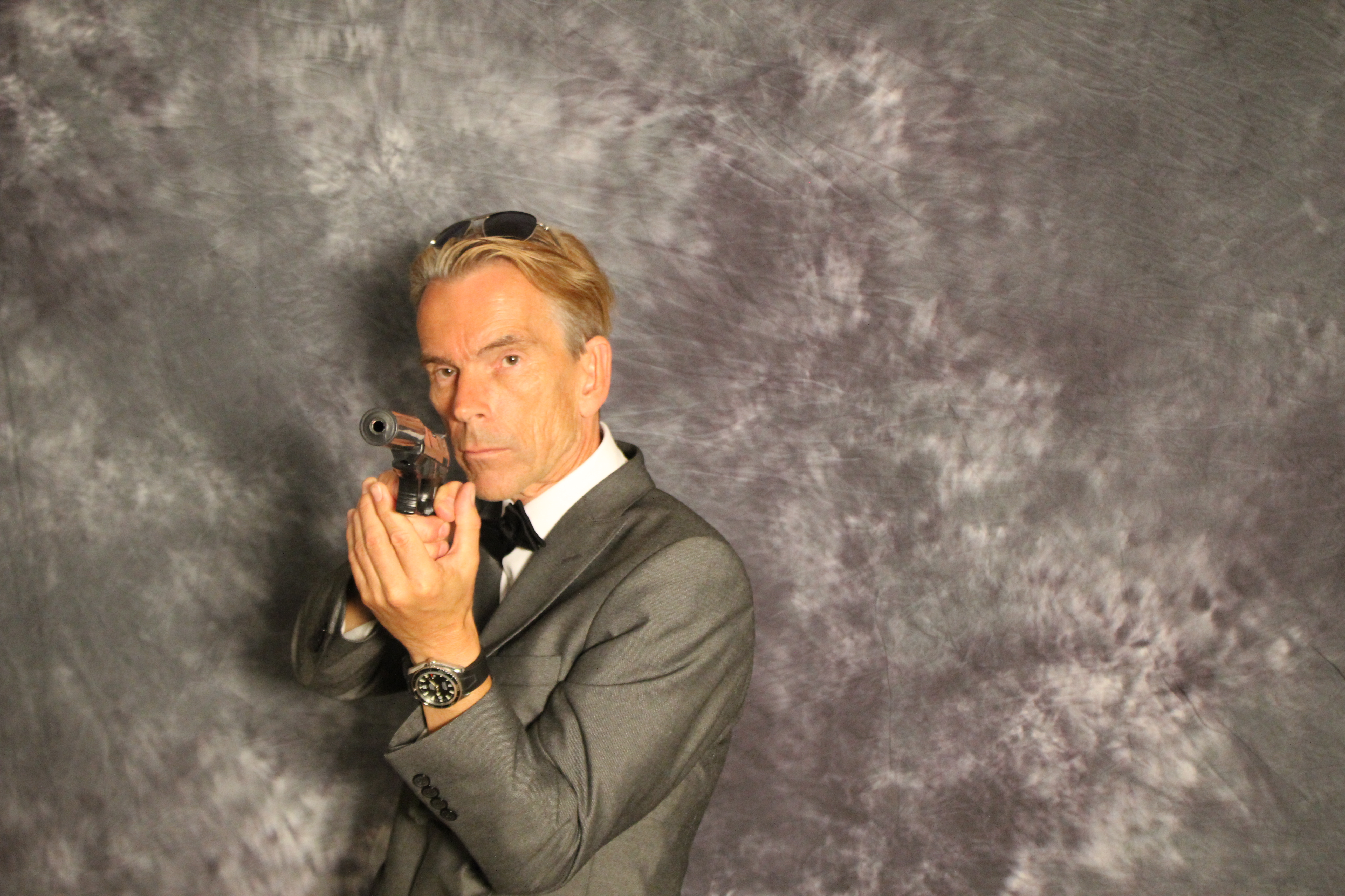 Han är ändamålsenligt klädd i smoking. Runt handleden sitter klockan
