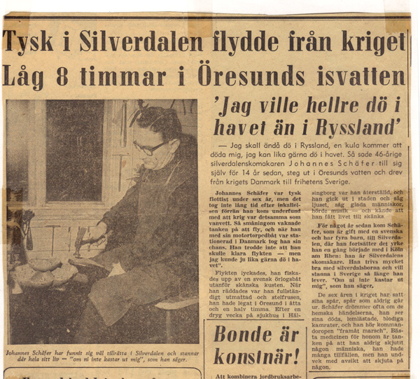 "Jag ville hellre dö i havet än i Ryssland" Jag ska ändå dö i Ryssland, en kula kommer att döda mig, jag kan likaväl dö i havet. Så sa den 46-årige silverdalensskomakare Johannes Schäfer till sig själv för 14-år sedan, steg ut i Öresunds vatten och drev från krigets Danmark till friheten i Sverige. Johannes Schäfer var tysk flottist under sex år. Gunnar Schäfers , dad/father Johannes Schäfer birthplace Sulzbach-Rosenberg EN FADERSGESTALTAuthor: Gunnar Schäfer