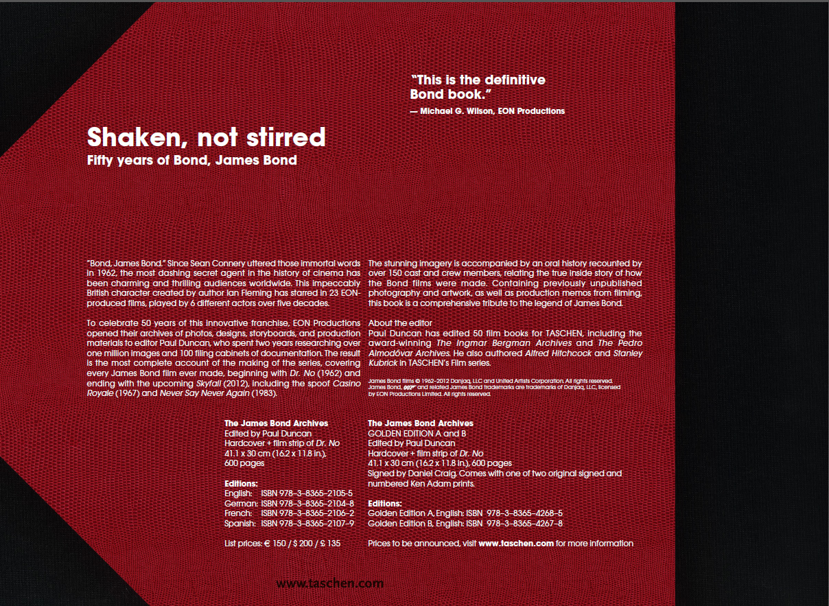 The wealth of on-set photos, unseen stills, set designs, storyboards, production memos, is supplemented by an oral history recounted by over 150 cast and crew members. From producers to stuntmen, directors to production designers, these personal narratives relate the true, inside story from the Bond sets, offering outstanding insight into the personalities and processes behind the most successful and longest-running film franchise in cinema history.