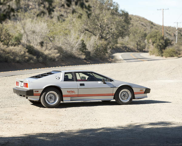 DESIGN BY GIORGETTO GIUGIARO VIN. SCCFC20A8DHF60363 ENGINE NO. LD910830720905 2,174cc DOHC 16-Valve Turbocharged 4-Cylinder Engine 2 Dellorto Carburetors 210bhp at 6,500rpm 5-Speed Manual Transaxle 4-Wheel Independent Suspension 4-Wheel Disc Brakes - Inboard at the Rear *Highly original, low-mileage example of a 007 favorite *Just over 32,000 miles from new and believed factory original paint and interior *The sole example produced in Silver Metallic over Red Leather *Recently serviced with new tires *Offered with Lotus Certificate of Vehicle Provenance, CARFAX and history file THE LOTUS ESPRIT The Lotus Esprit became an instant star when James Bond and 'Q' chose it for the 007 film 'The Spy Who Loved Me', and the ultimate product placement came with its ability to transform into a submarine; looking even more svelte in the water. The Esprit design was unmistakably from the pen of Giorgetto Giugiaro, having come about following a chance encounter between Giugiaro and Lotus boss Colin Chapman. The Esprit featured all-independent suspension and Lotus's own 16-valve, four-cylinder engine placed transversely mid-ship, and mated to a five-speed transaxle. Disc brakes were fitted to all four wheels, the rears being mounted inboard. The Esprit metamorphosed through several series, its first revision being when it gained a 2.2-litre engine and then turbo-charged induction. Introduced in 1980, the Garrett-blown Turbo Esprit produced 210bhp and was good for a top speed of 148mph, with 60mph attainable in just 6.1 seconds. A Bond-car just like the first series Esprit, the Turbo Esprit starred in 'For Your Eyes Only' as 007's four-wheeled weapon for both chasing criminals in Spain, or with skis strapped to the back for a skiing trip to Italy's posh Cortina ski resort. Hand built in limited numbers; the Esprit remains one of the most iconic and popular thoroughbred sports cars ever produced. THE MOTORCAR OFFERED Offered here is an incredibly well preserved, low mileage example of the desirable Turbocharged Esprit. Completed at Lotus Cars Ltd in August of 1983, this superb example was finished just as it appears today, in silver metallic with red decals over a red full-leather interior, optioned with air conditioning and equipped for the US market. According to the Lotus-issued Certificate of Vehicle Provenance, this Turbo Esprit was the 82nd of the 150 cars produced, of which 7 were finished in silver metallic, but is in-fact the sole example completed with red interior. The new Esprit arrived in the US later that year, where it was soon after registered with the first owner. The CARFAX report states the Esprit residing in Washington State in the mid-1990s, before migrating to California in 2001, where it has remained until now. With just over 19,000 original miles recorded in 2001, the silver Turbo Esprit found a long-term owner in the San Diego area with a Mr. Anthony Gilmore. Service records indicate that Lotus service center Symbolic Motor Cars replaced the timing belt and serviced the car in June of 2002 with just over 20,000 miles on the odometer. Multiple logs on the CARFAX reports the Esprit's low mileage up through he 2000s, and service records from San Diego based Viking Motorsports can be found in the history file. Mr. Glimore would keep the car until 2013, where it passed through another San Diegan enthusiast, before being purchased by the consignor in 2014. The low-mile Lotus has since been used on weekend trips between San Francisco and Los Angeles, as well as on Sunday drives through Napa Valley, and was recently serviced with four new tires. It is evident upon close inspection that this Turbo Esprit has been cared for since new. With an odometer reading of just over 32,000 miles, and a cosmetic condition to match it, few 30-plus year old cars present as well as this one. The silver paint is believed to be the original applied by Lotus from new, and the same goes for the interior. The cars original spare wheel is still present, and factory applied decals and tags are present throughout. Furthermore, the Lotus-issued Certificate of Vehicle Provenance confirms that the car retains its original, matching numbers engine. A very good example of a Roger Moore favorite, this highly original Esprit is ready for the next caretaker. Saleroom notices