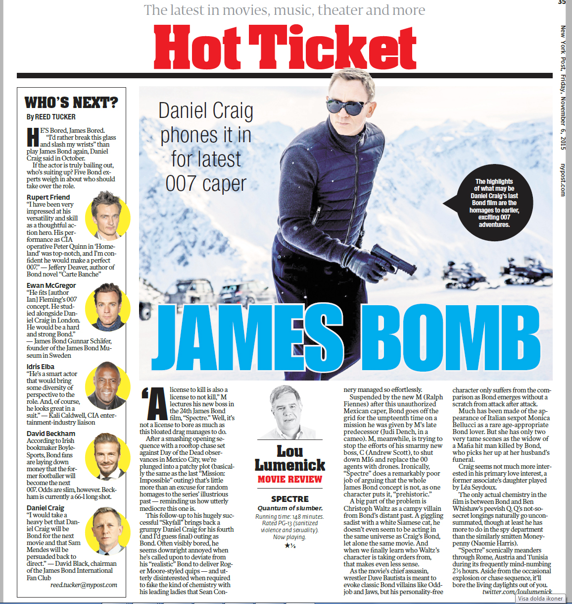 “He fits [author Ian] Fleming’s 007 concept. He studied alongside Daniel Craig in London. He would be a hard and strong Bond.” — James Bond Gunnar Schäfer, founder of the James Bond Museum in Sweden